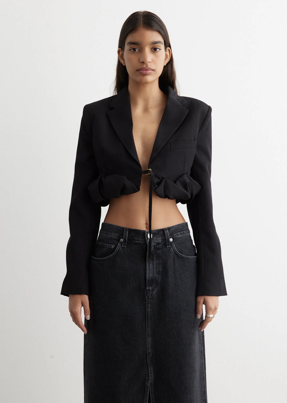 Vivacious and modernist French fashion-house, Jacquemus, can be described as a phenomenon. The brand’s accessories and ready-to-wear collections are consistently awe-inducing season after season. Crafted from wool, the La Veste Croissant Blazer is cut to a cropped, structured fit. Featuring a twisted and rolled hem, extended button cuffs and an adjustable metal D-ring fastener.
