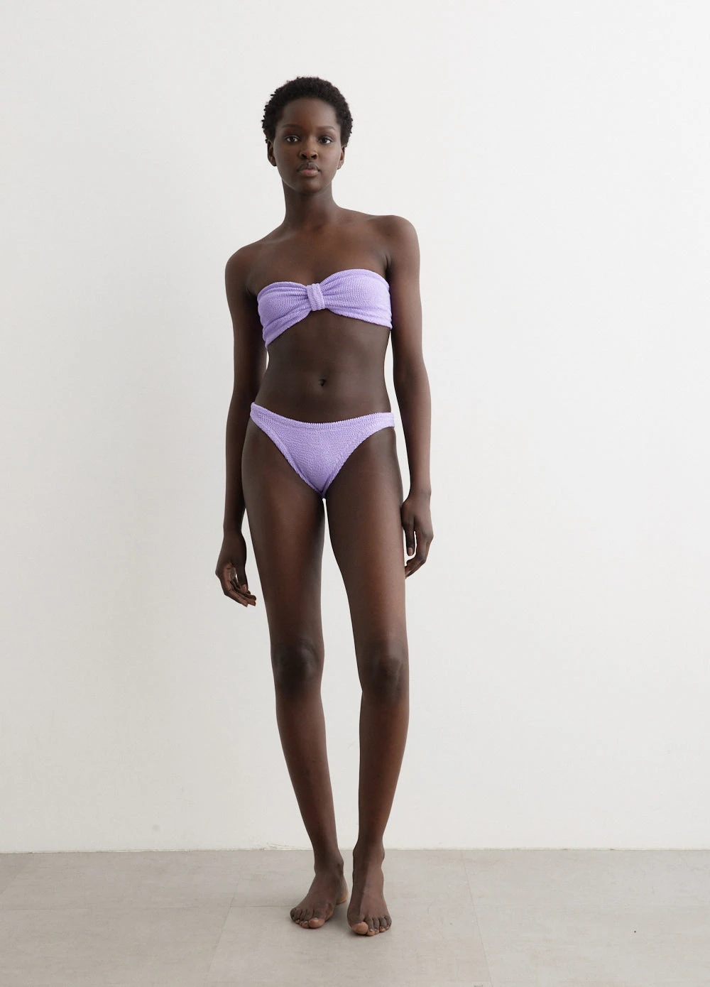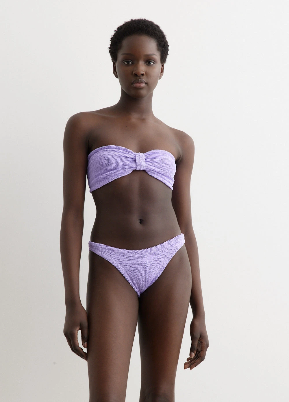 Make a splash in Hunza G’s signature seersucker swimsuits. This season’s one-size-fits-most collection arrives in timeless and retina-grabbing hues. Crafted from the brand’s distinctive stretch fabric, the Jean Bikini boasts a strapless top and high-cut bottoms.Â