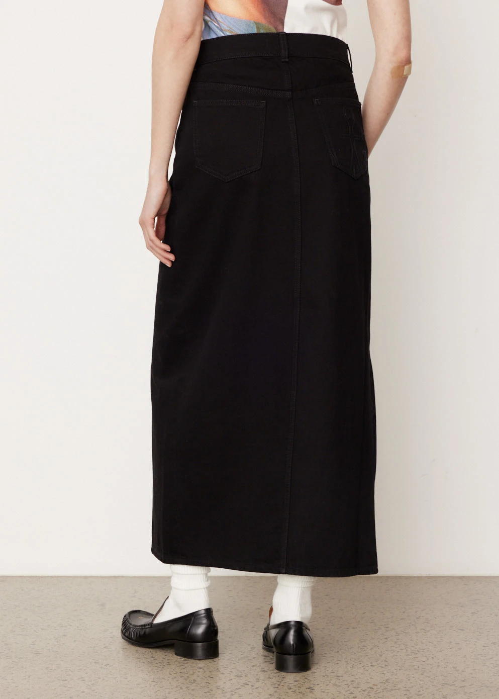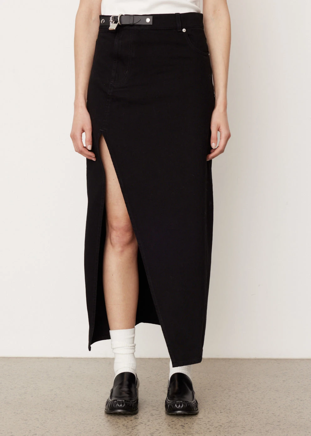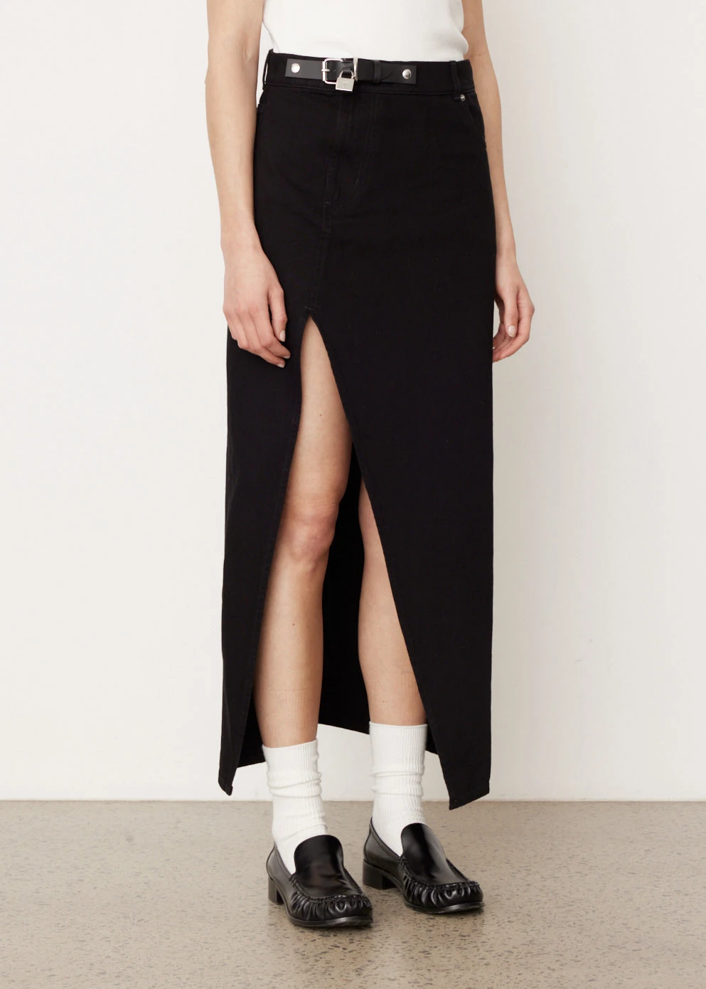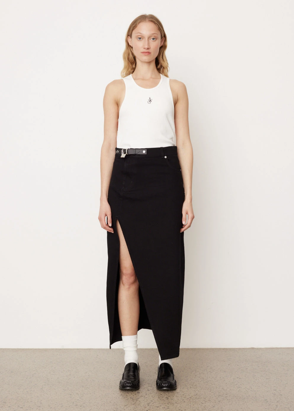 Heavily influenced by the British countryside and pop culture, JW Anderson blends luxury with casual charm using unexpected and bold palettes. The Padlock Strap Long Slit Skirt is crafted from soft cotton and is tailored to a straight line silhouette with an asymmetrical closure. Featuring a removable leather strap with the brands signature silver padlock attached.