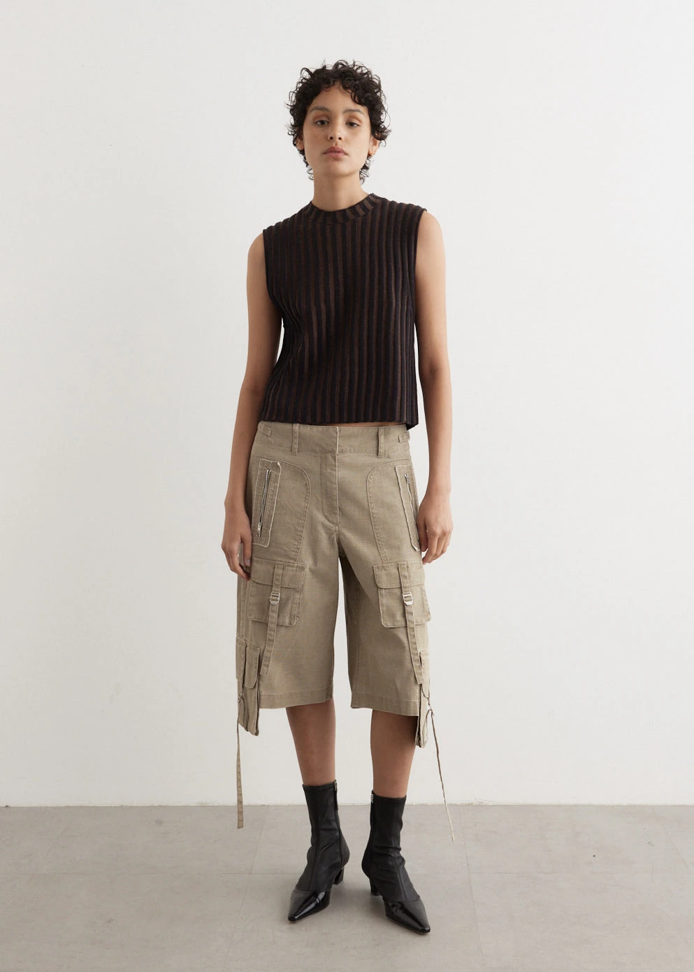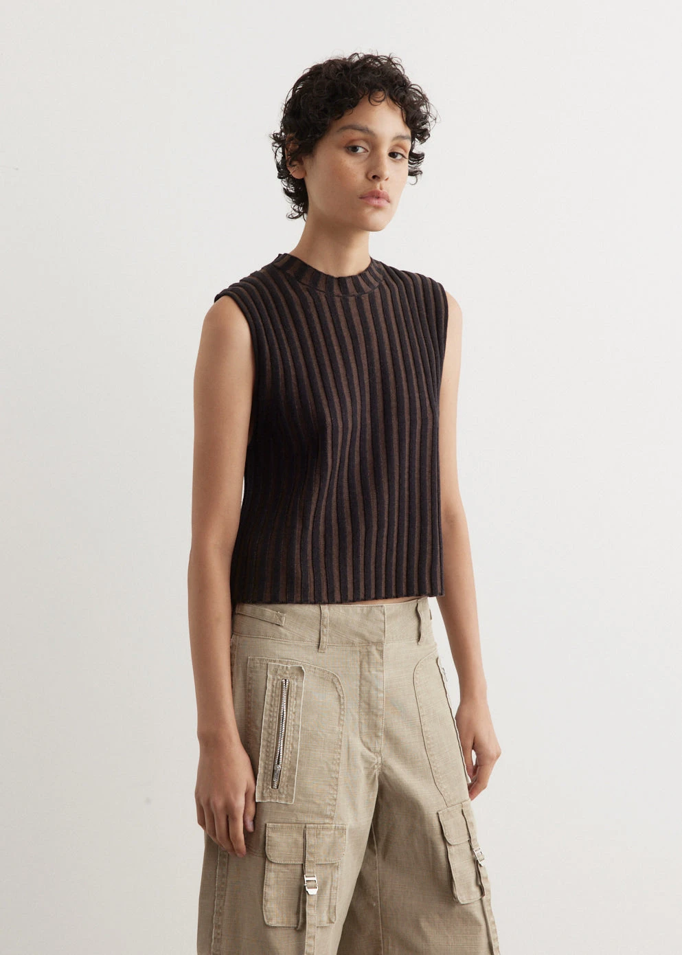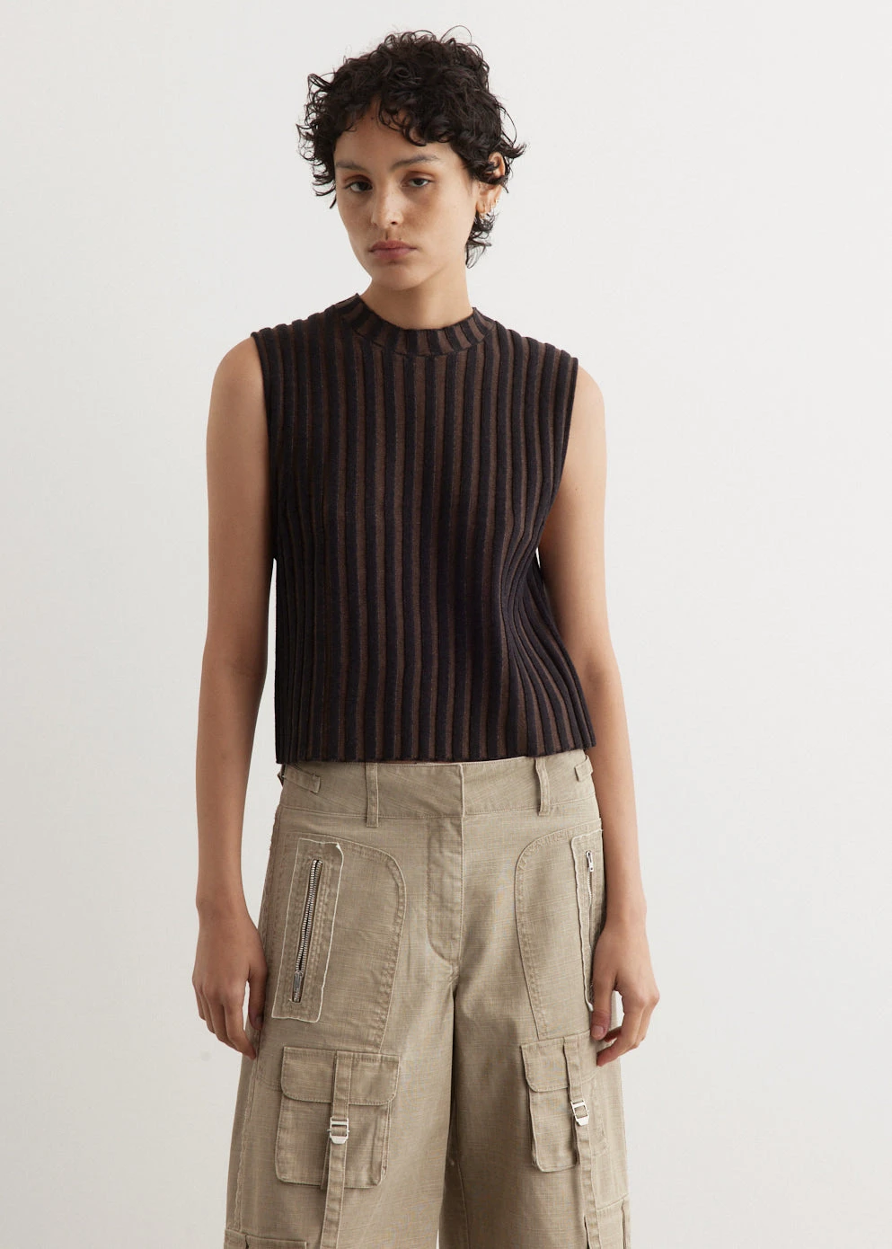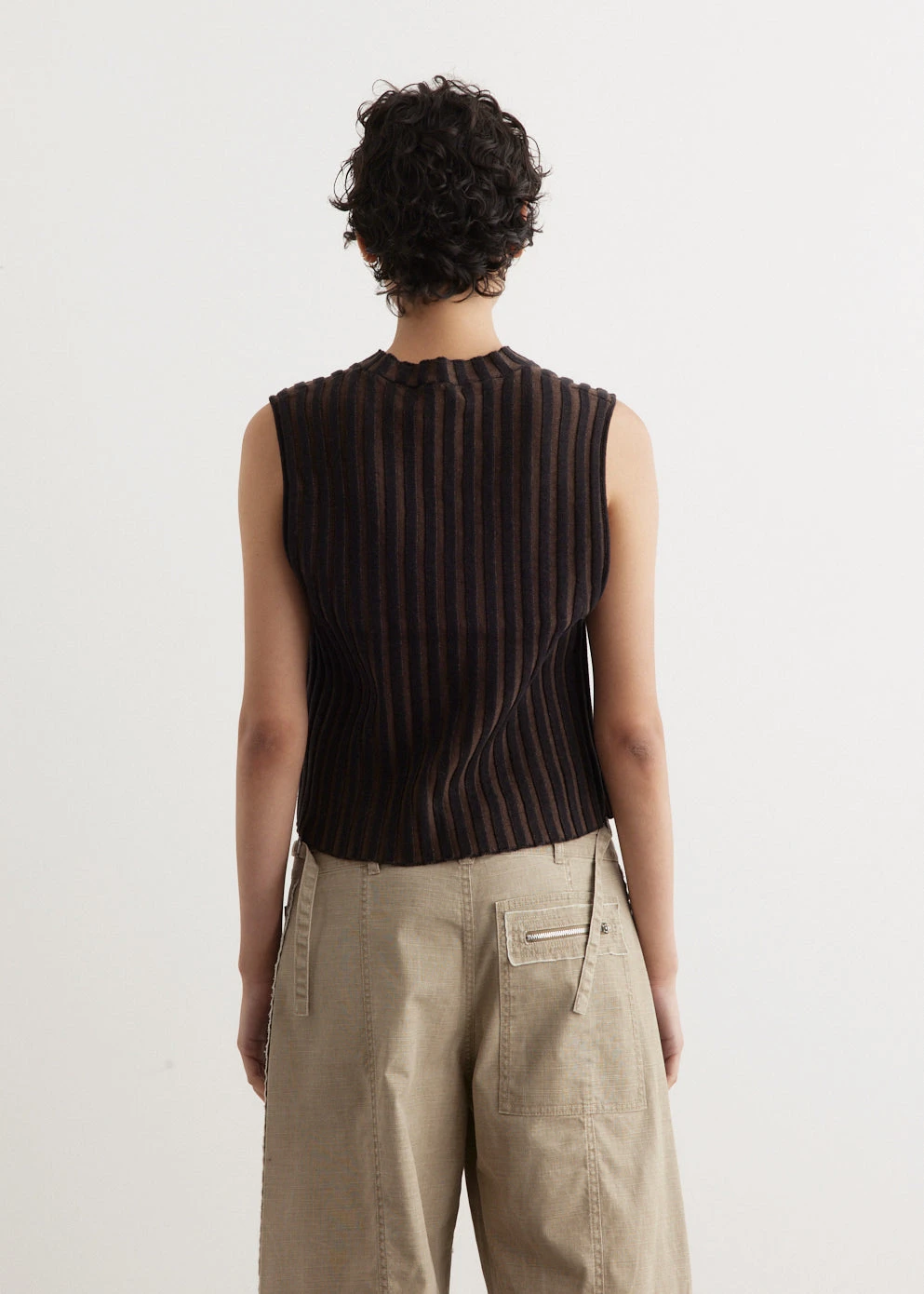 Known for a gritty aesthetic and decidedly androgynous design, Eckhaus Latta offers up a collection that is all their own in originality through painterly prints, textures and silhouettes. Knitted from a linen-cotton blend, the Keyboard Vest is cut a slightly cropped, slim fit and boasts a plated rib that creates a striking optical stripe design.Â