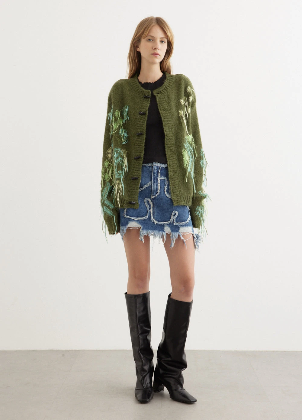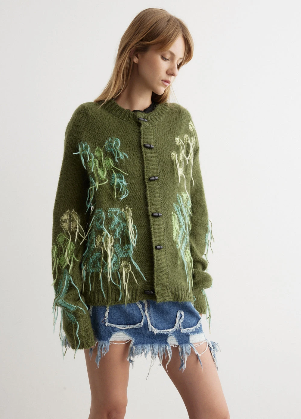 The identity of Andersson Bell was inspired by the merge of two contrasting cultures, reinterpreting Scandinavian aesthetic to create garments from a Korean perspective. Crafted from a soft mohair blend fabric, the Macaron Intarsia Cardigan flaunts distressed accents. t’s adorned with toggled closures and ribbed trims.