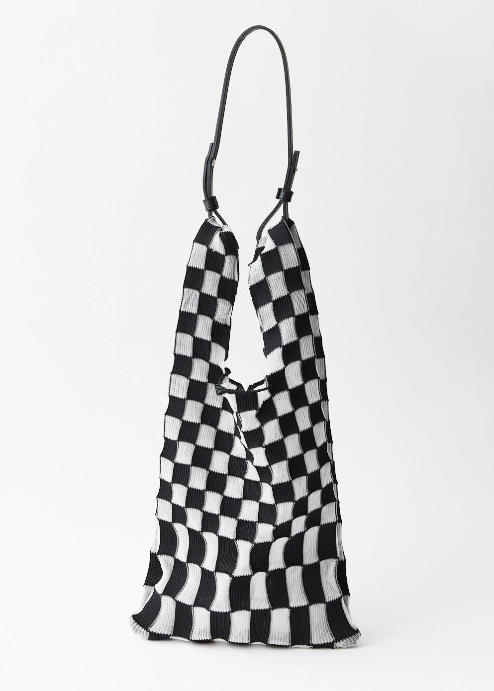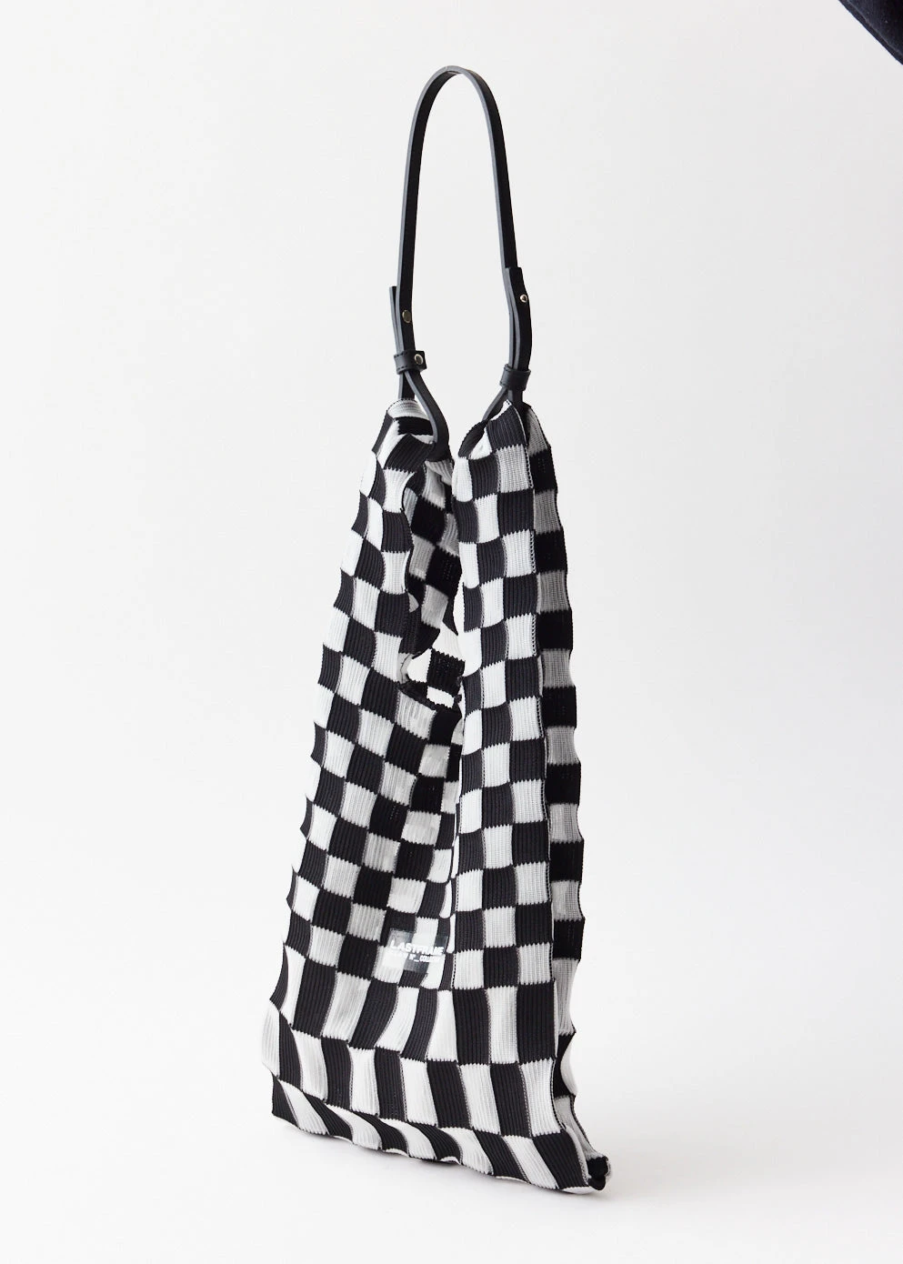The Medium Sheer Ichimatsu Market Bag celebrates traditional Japanese craft techniques and emulates costumes from the Kabuki theatre. The unique ribbed knit features a checkered pattern with sheer square, removable leather shoulder strap and gusseted edges, ideal for carrying everyday essentials.
