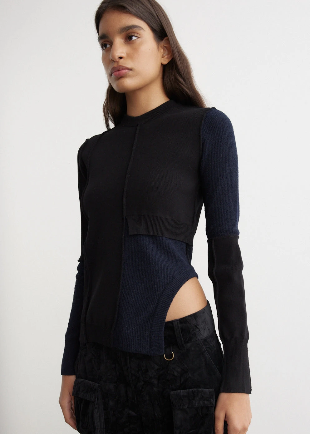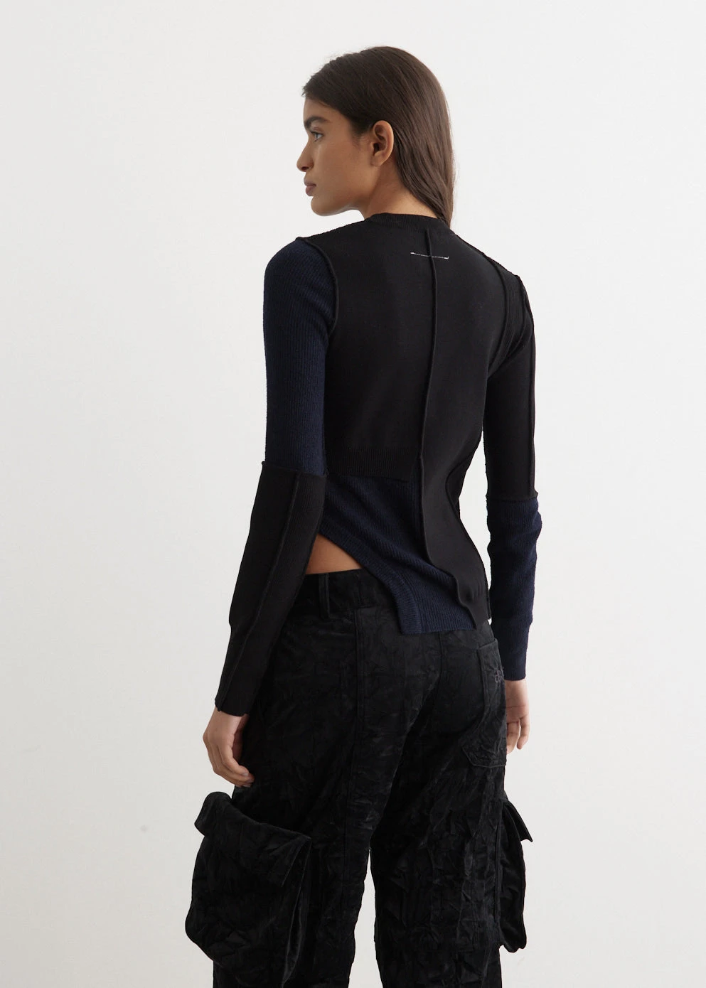 Founded in 1997, MM6 is an offshoot of Maison Margiela which has become a leader in the fashion industry thanks to its modern innovation and edge. Crafted from a viscose blend, the MM6 Crewneck Sweater is cut a form fit. Featuring an asymmetrical side hemline, two tone panels.Â