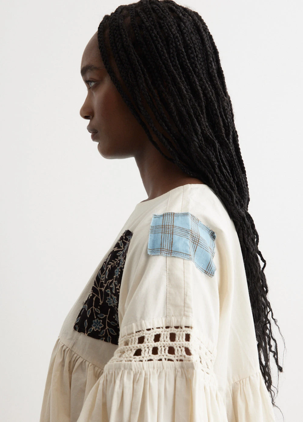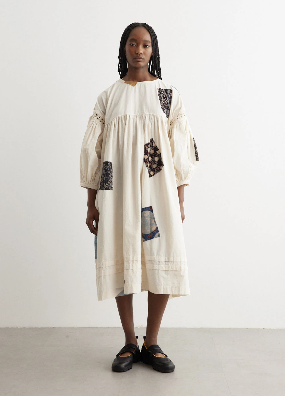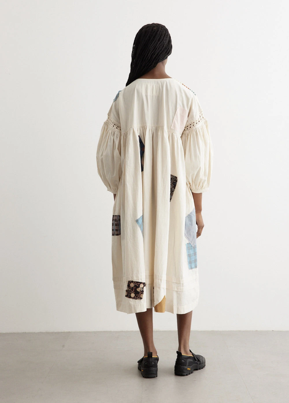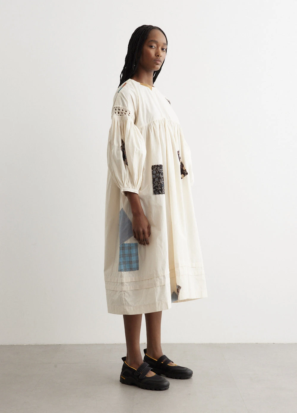 With an ethical approach to production, STORY mfg. looks to biodegradable materials, natural dye processes and local craftsmanship to create each collection. Crafted from organic cotton, the Mon Dress is a voluminous, oversized fit silhouette with naturally dyed fabrics in a scattered patchwork design.Â