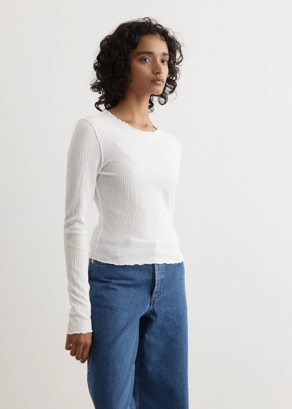 Incu Collection introduces their February 2024 collection, embracing the theme of friendship and shared memories through clothing. The line seamlessly blends vintage and contemporary elements, offering modernised 90s tailoring and elevated prints with photographic and abstract imagery. Made from a crinkled polyester blend, the Pia Long Sleeve T-Shirt is cut to a slightly cropped length and has a slim fit.Â