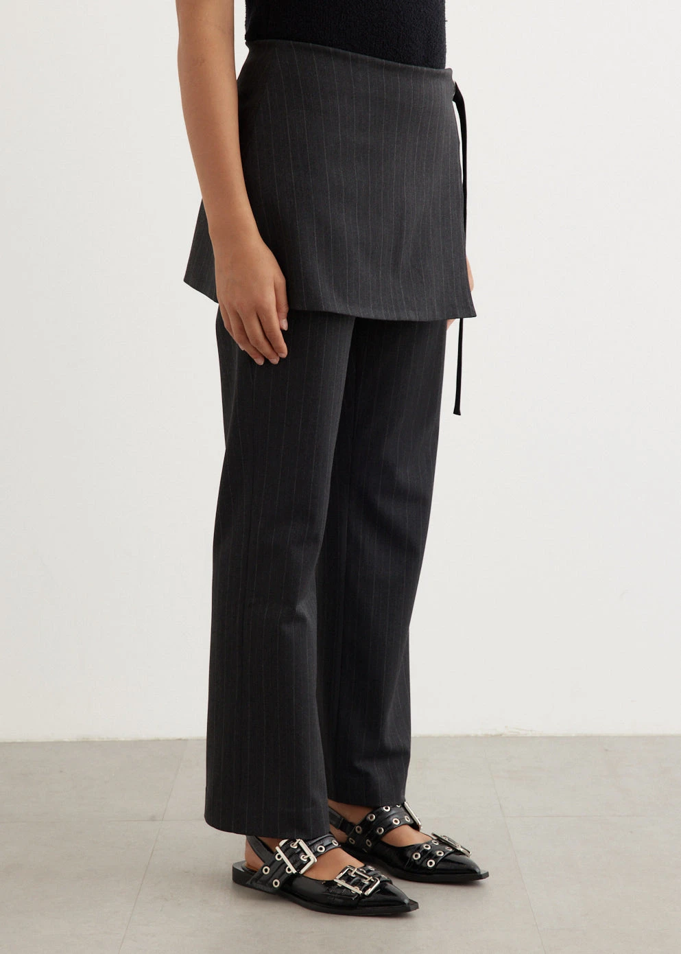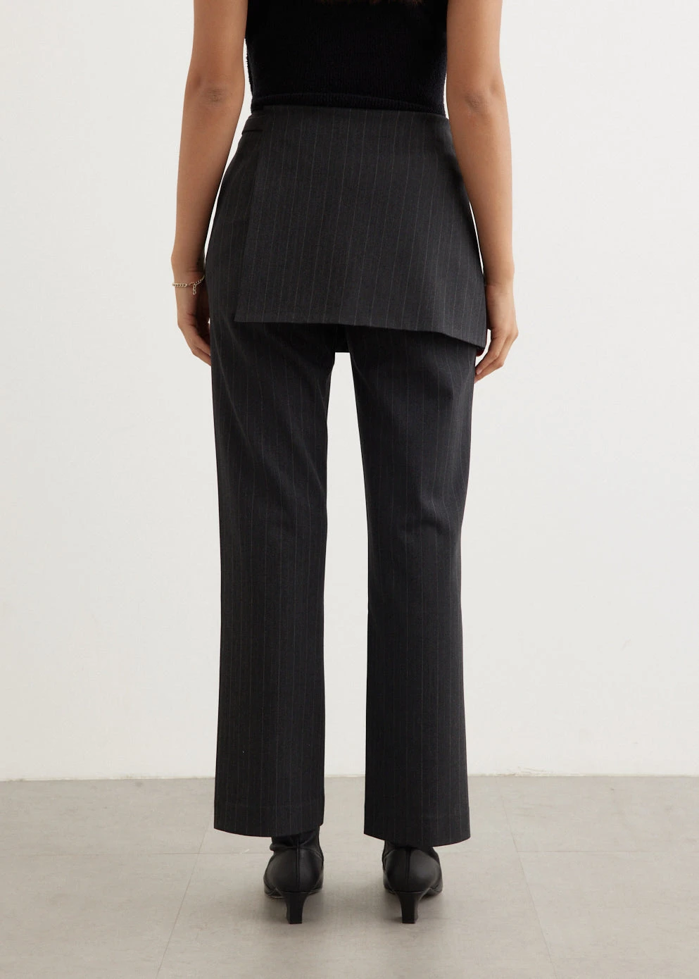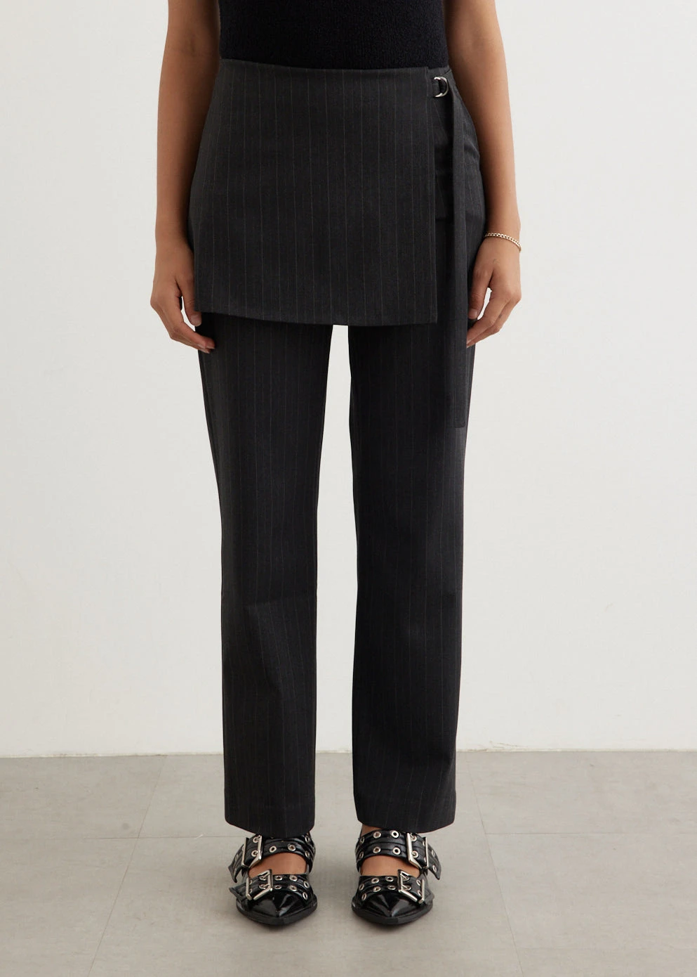 Incu Collection seamlessly blends vintage and contemporary elements, offering modernised 90s tailoring and elevated prints with photographic and abstract imagery. A contemporary take on a classic silhouette, the Pretender Tailored Pants are tailored to a relaxed, straight fit. Boasting an added midi skirt layer at across the front.
