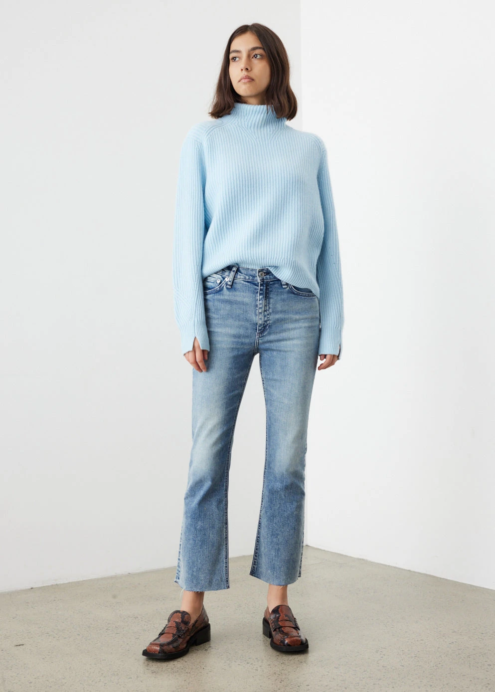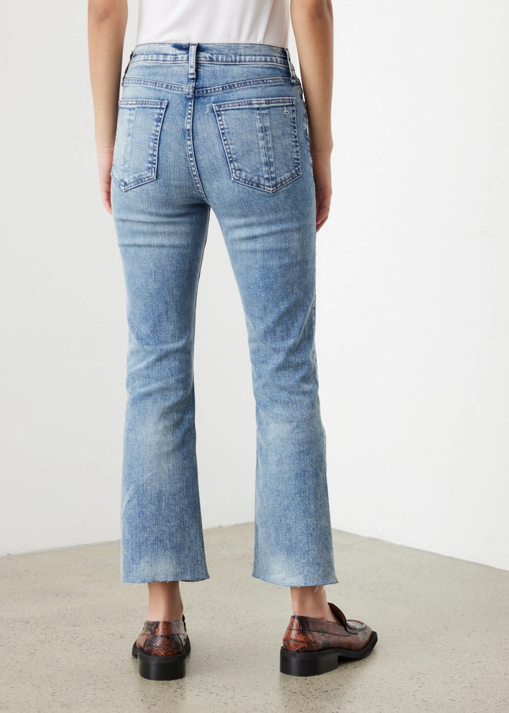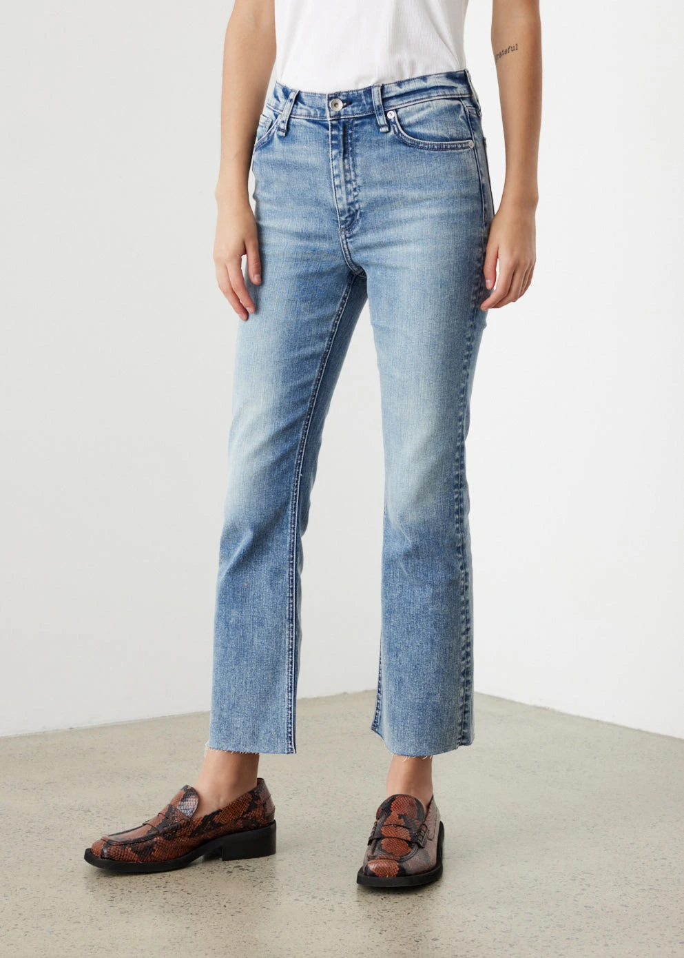 rag & bone update their iconic Nina High-Rise Ankle Flare Jeans with an acid wash that leaves a lived-in feel. Crafted in cotton-blend denim, they feature five-pocket construction with a flared cropped leg and a raw hemline. Tuck in a crisp white t-shirt and pair with the Embossed Snakeskin Loafers for a refined casual look.