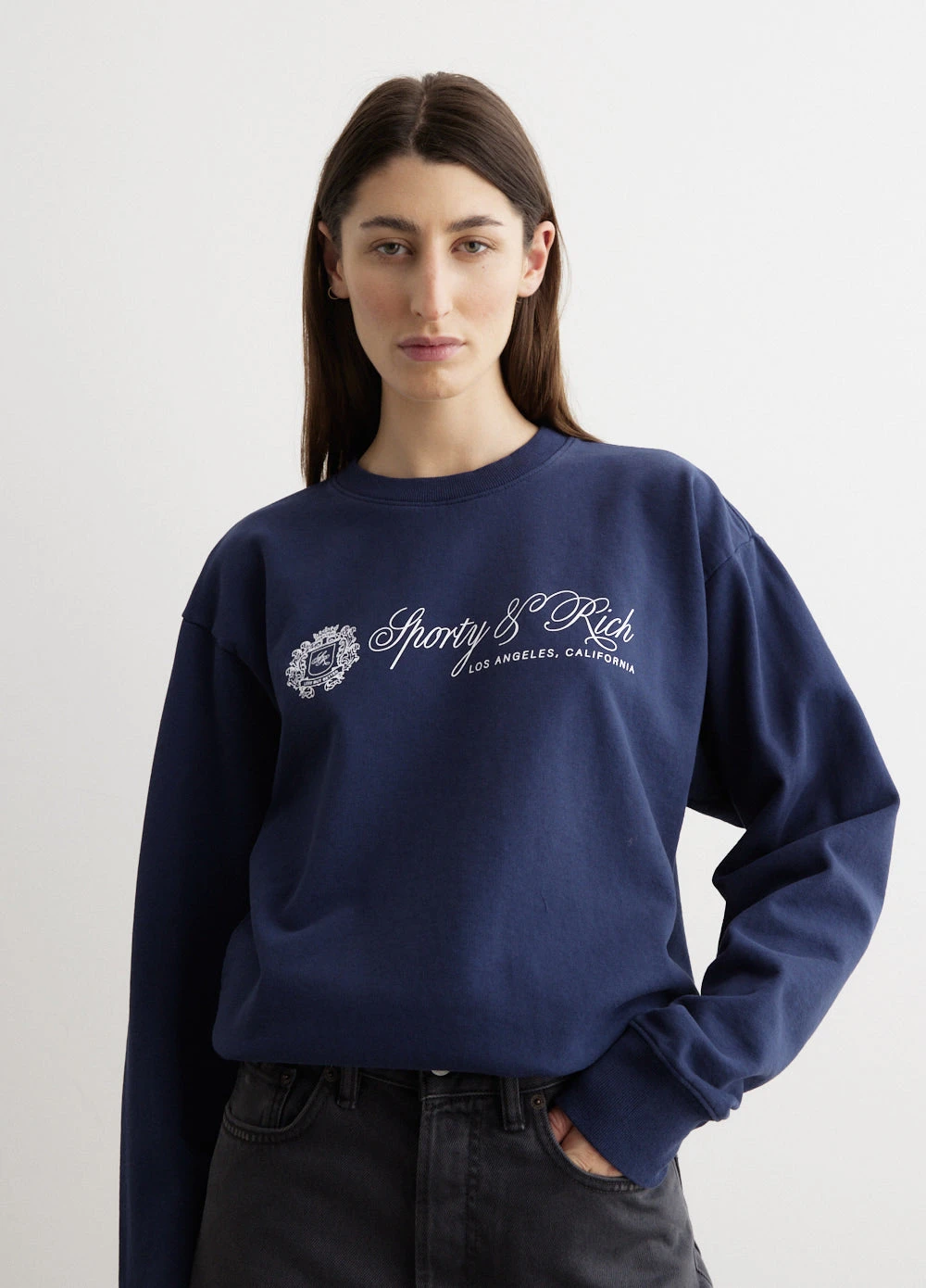 All about health and wellness, Sporty & Rich is the Los Angeles-based label that prides itself on sustainability, quality and a distinct ’90s-inspired sports aesthetic. The Regal Crewneck Sweatshirt is constructed from a soft cotton jersey which lends warmth and comfortability to this relaxed sweatshirt. Finished with the brands logo print across the chest.Â