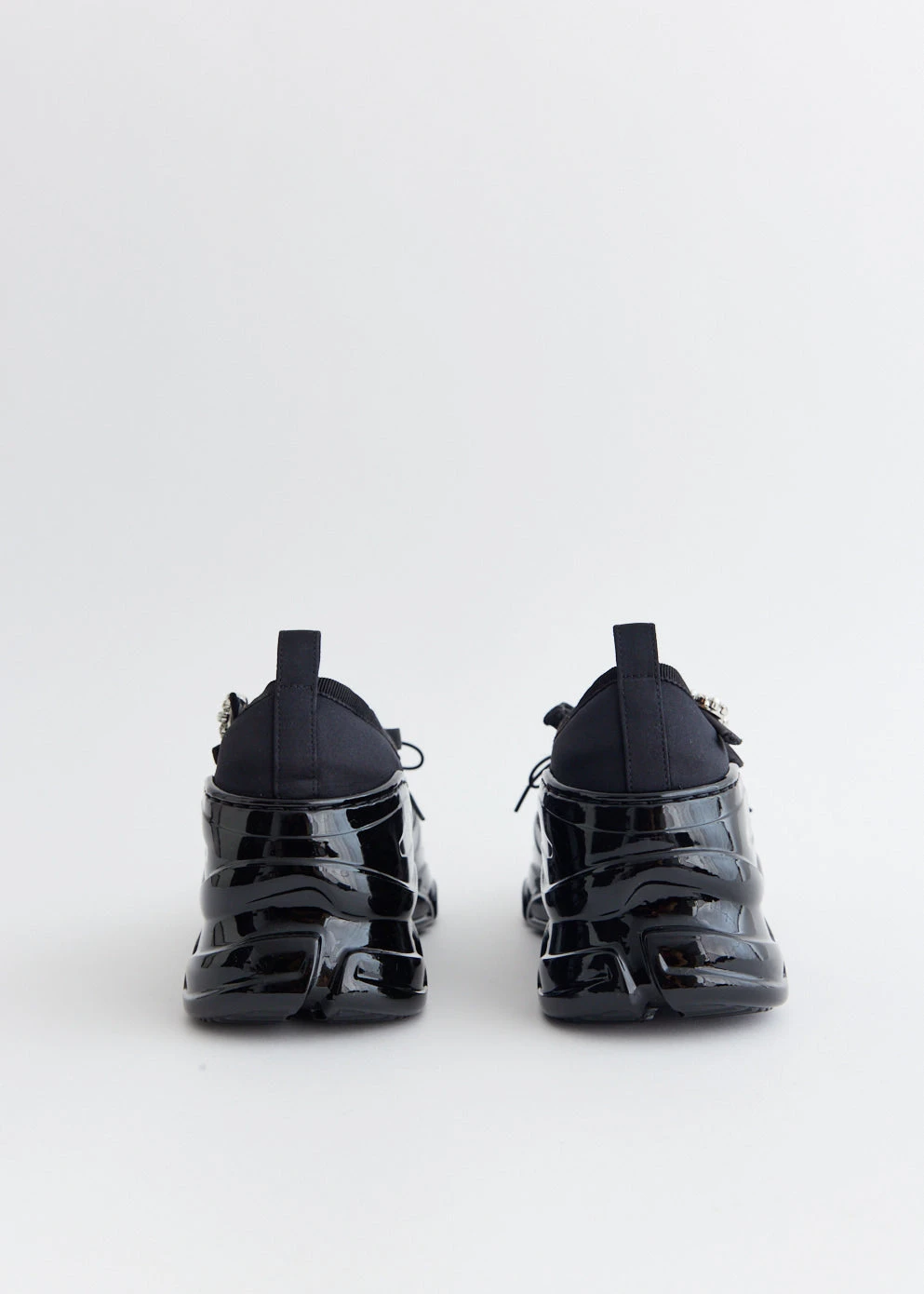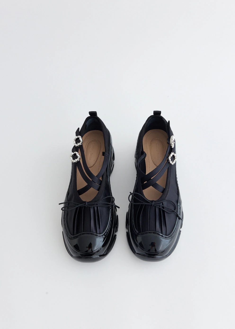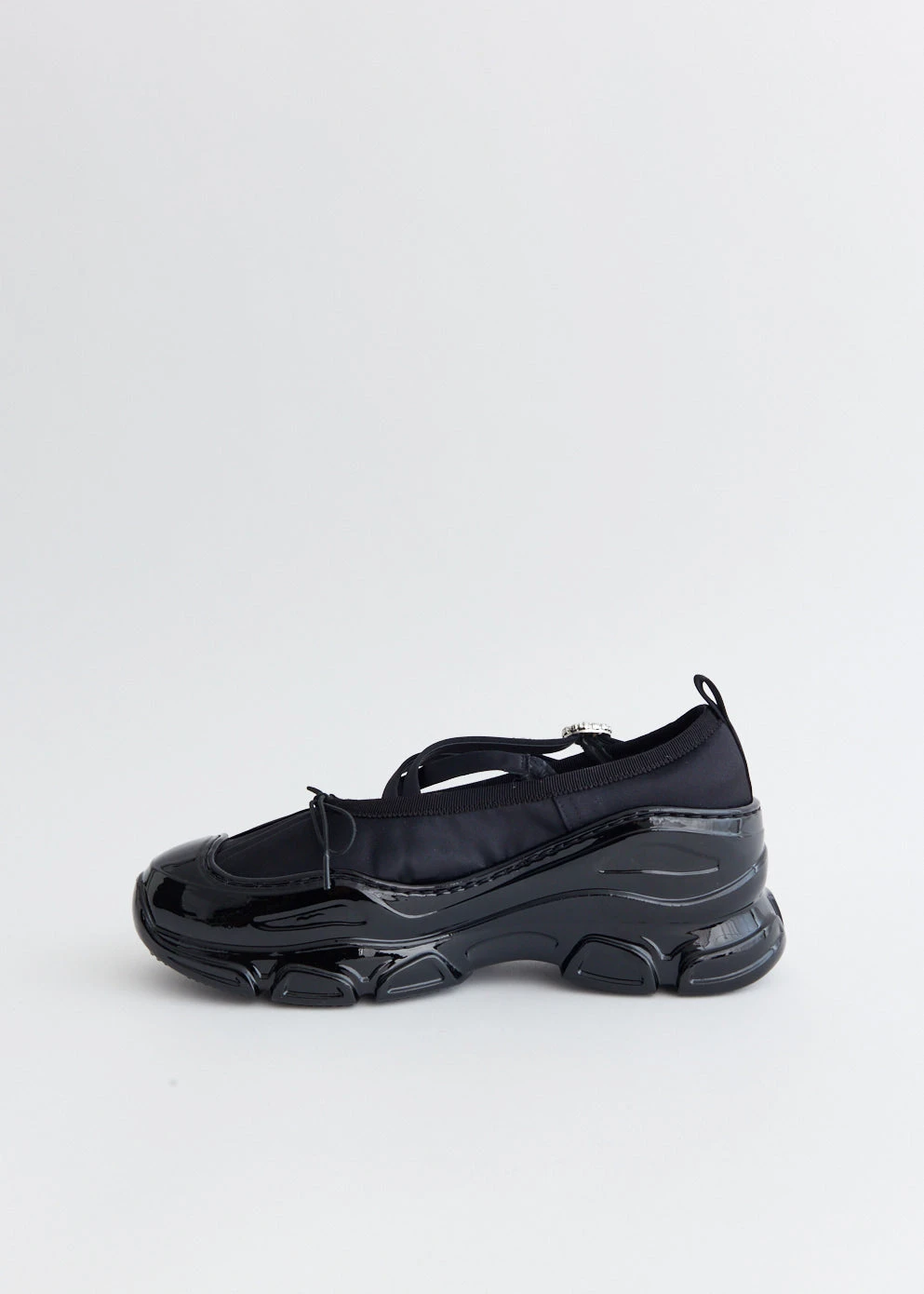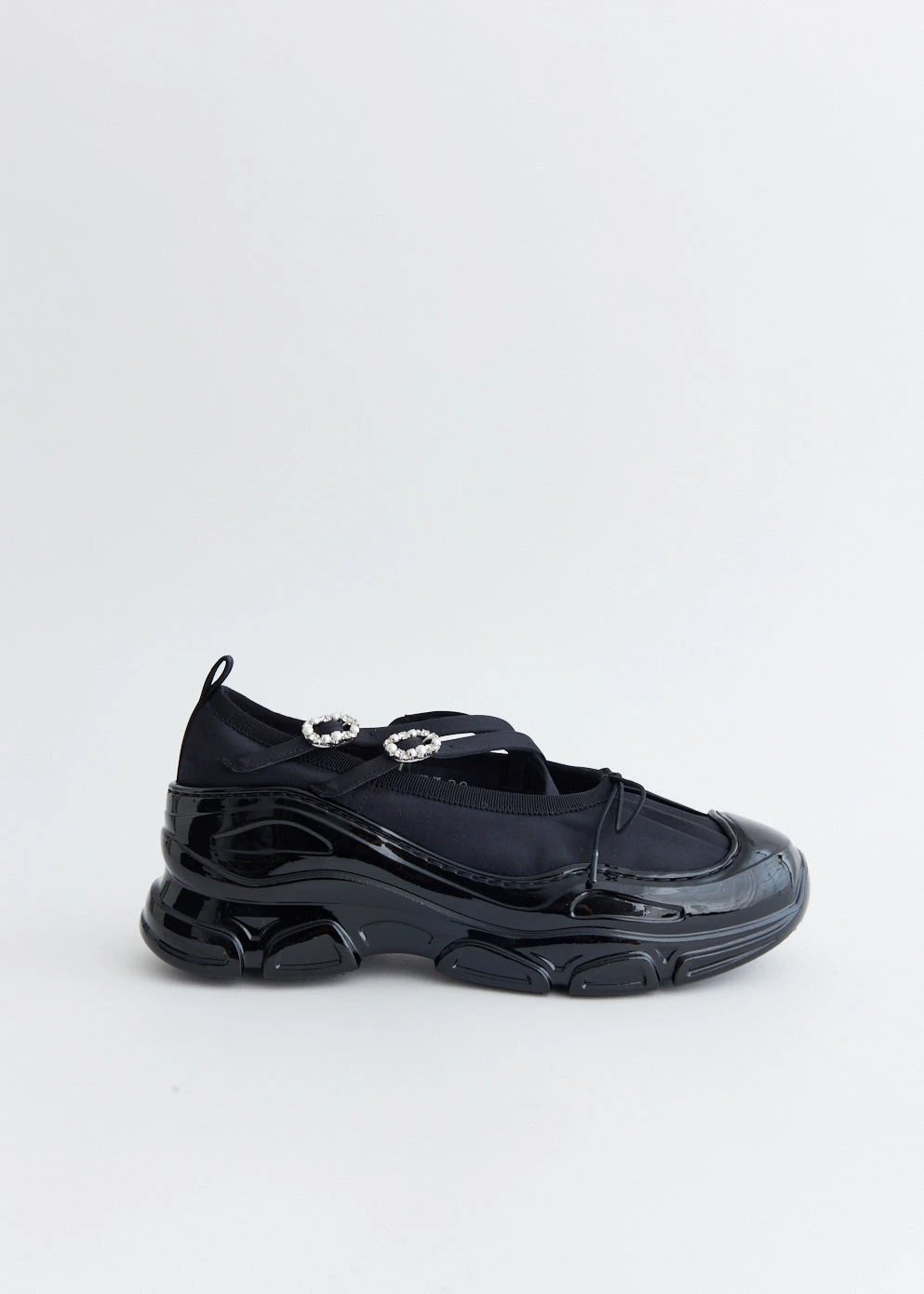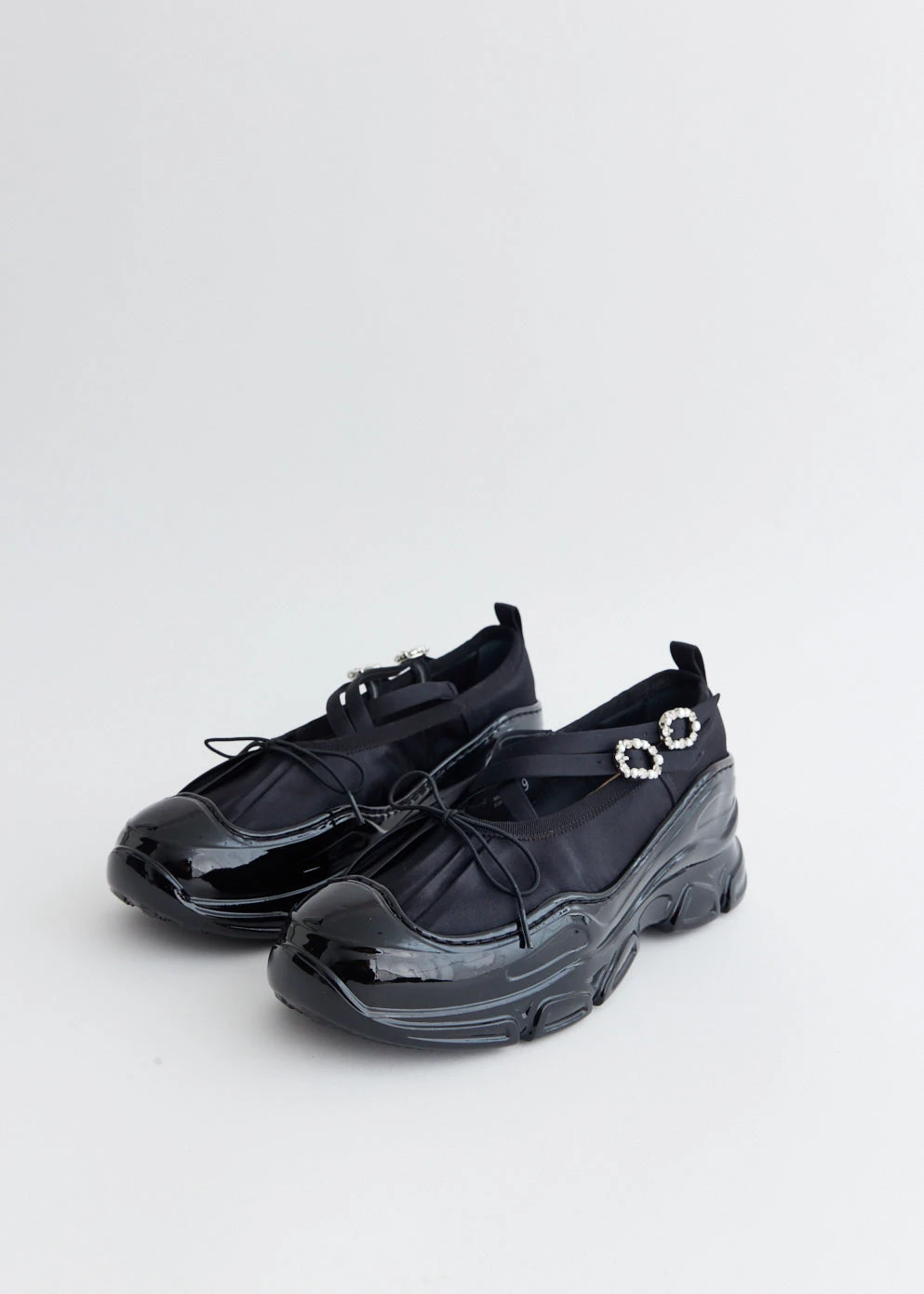 Dublin-born designer Simone Rocha is known for her precise direction and youthful, rebellious aesthetic. The Classic Criss Cross Tracker Ballerinas are updated with new criss cross straps elasticised at vamp. Adorned with a buckle detailed with faux pearls and diamante crystals. This ballerina combines the classic elements of a traditional ballet shoe with a sporty design.