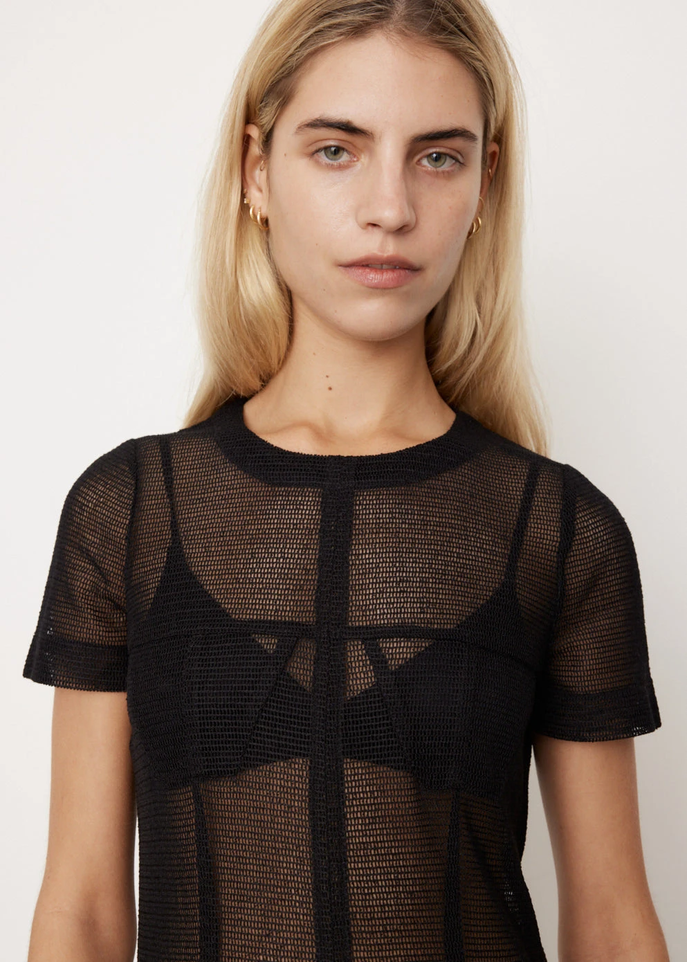 Known for a gritty aesthetic and decidedly androgynous design, Eckhaus Latta offers up a collection that is all their own in originality through painterly prints, textures and silhouettes. Crafted from a sheer crepe mesh, the Siren Dress is tailored to a relaxed fit. Inspired by lingerie, it features seaming details at the chest, with a front and back slit to allow for a more comfortable fit.