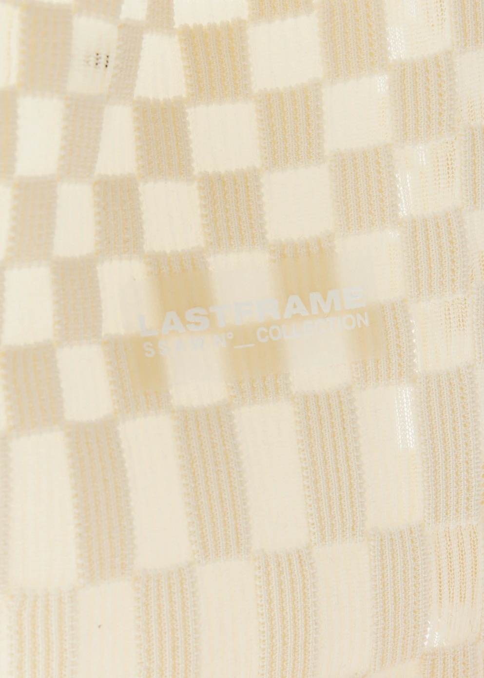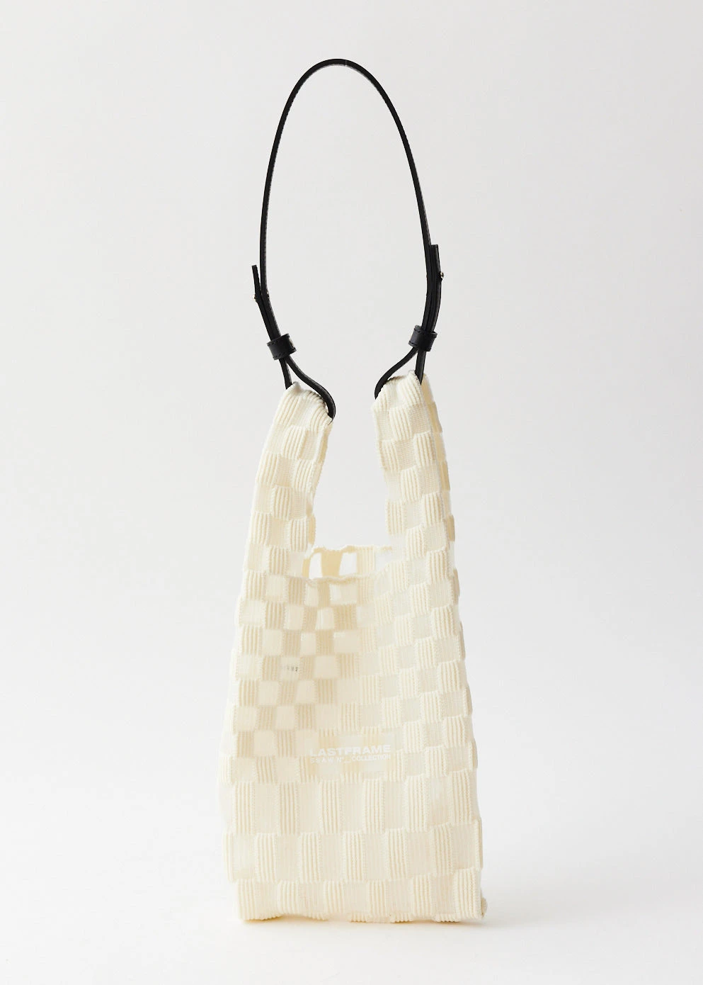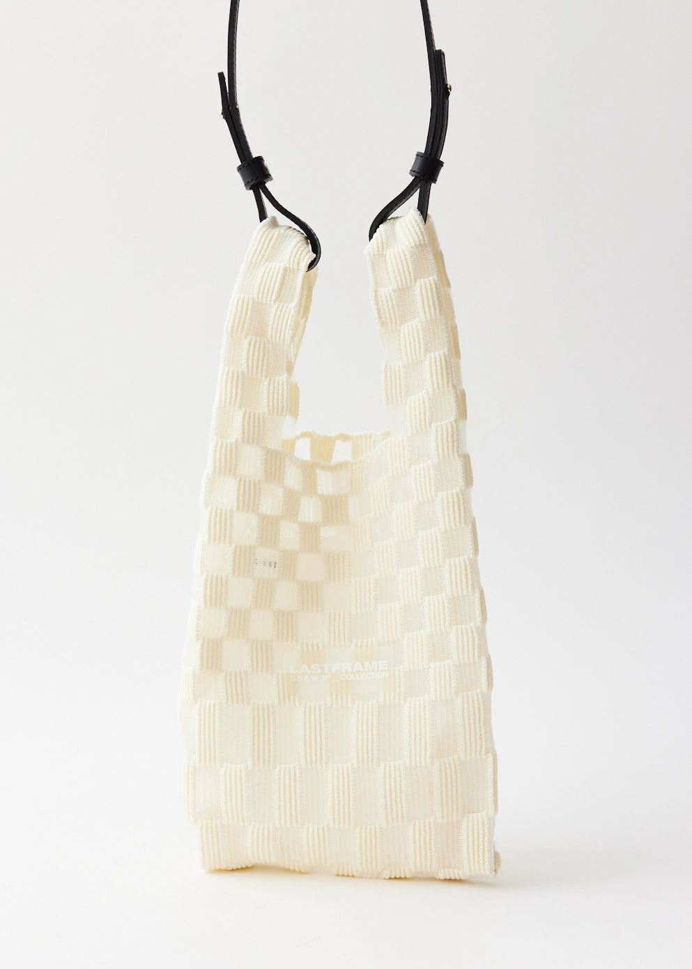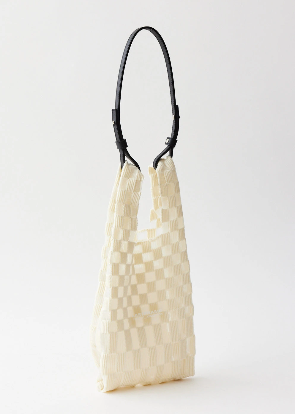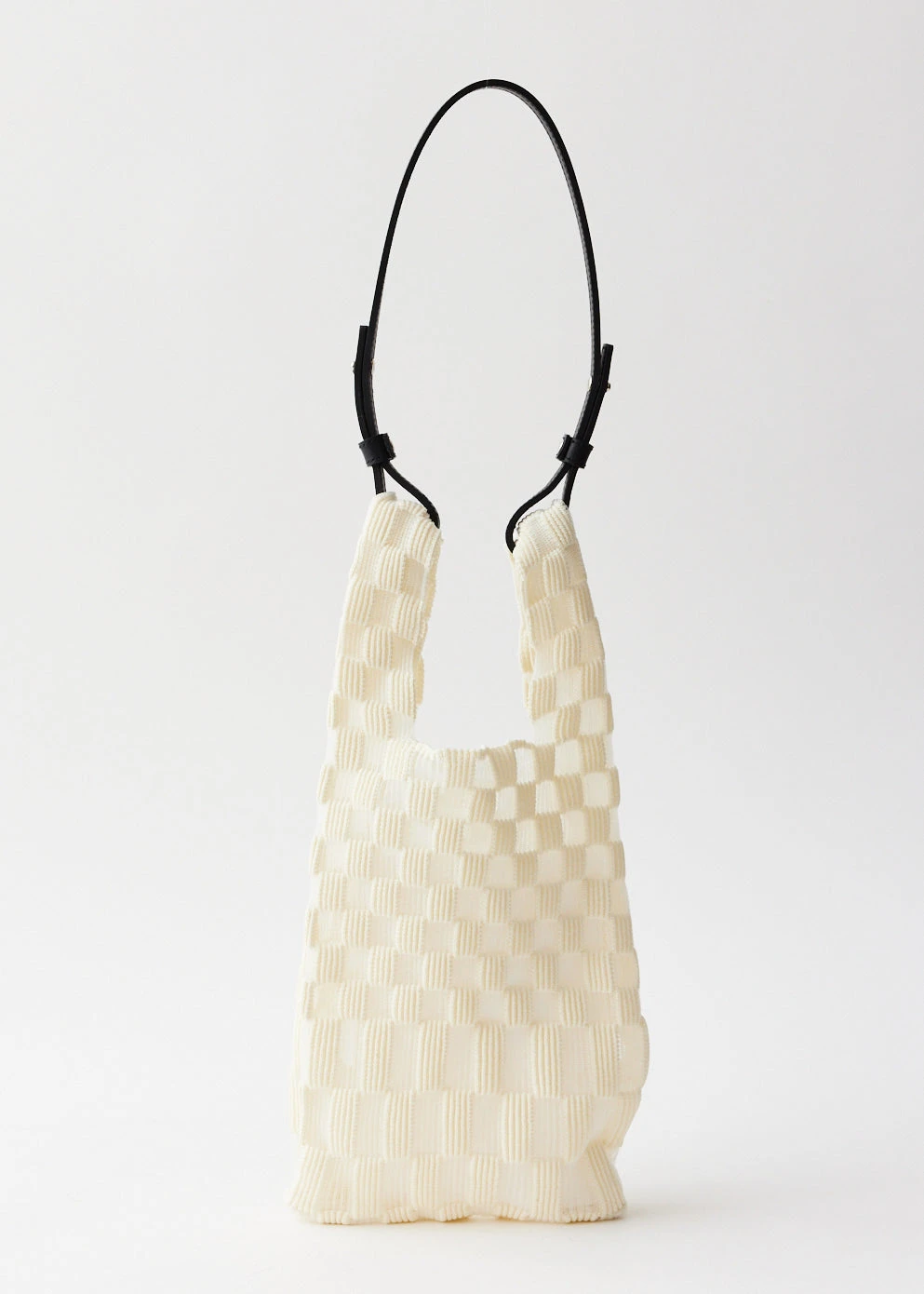 The Small Sheer Ichimatsu Market Bag celebrates traditional Japanese craft techniques and emulates costumes from the Kabuki theatre. The unique ribbed knit features a checkered pattern with sheer square, removable leather shoulder strap and gusseted edges, ideal for carrying everyday essentials.
