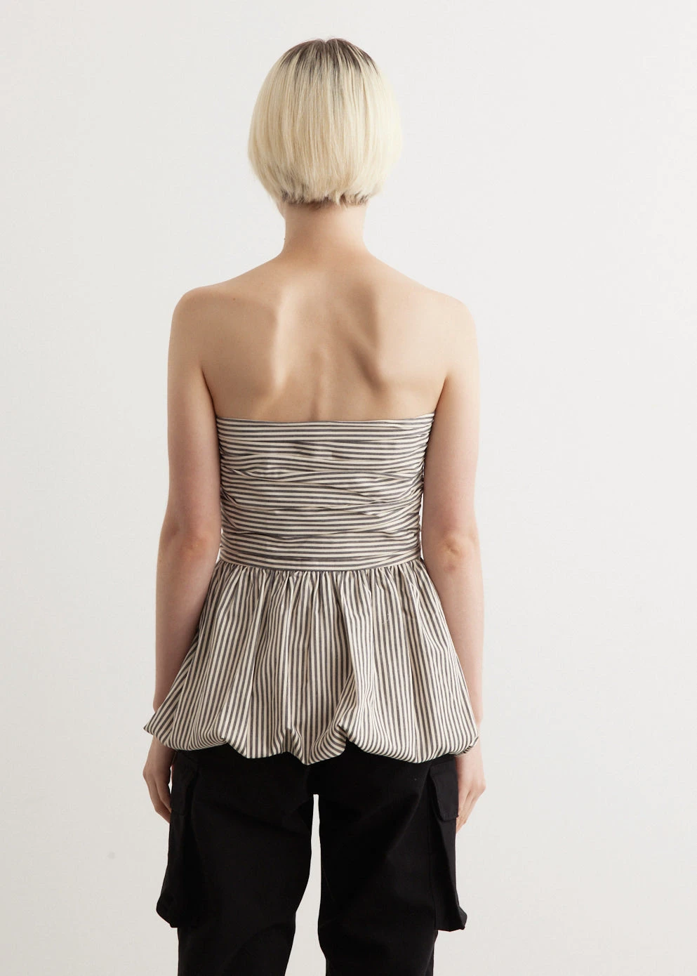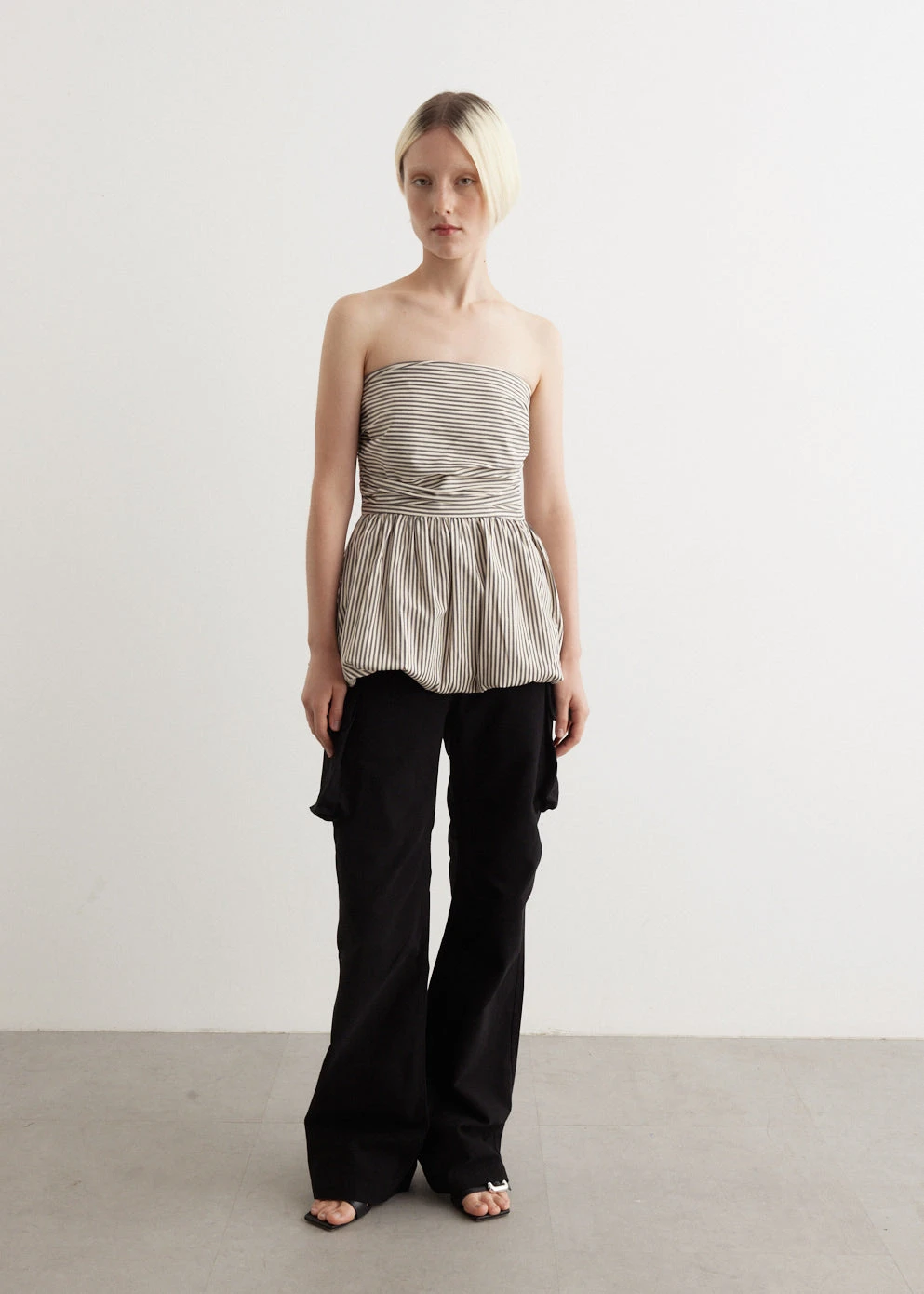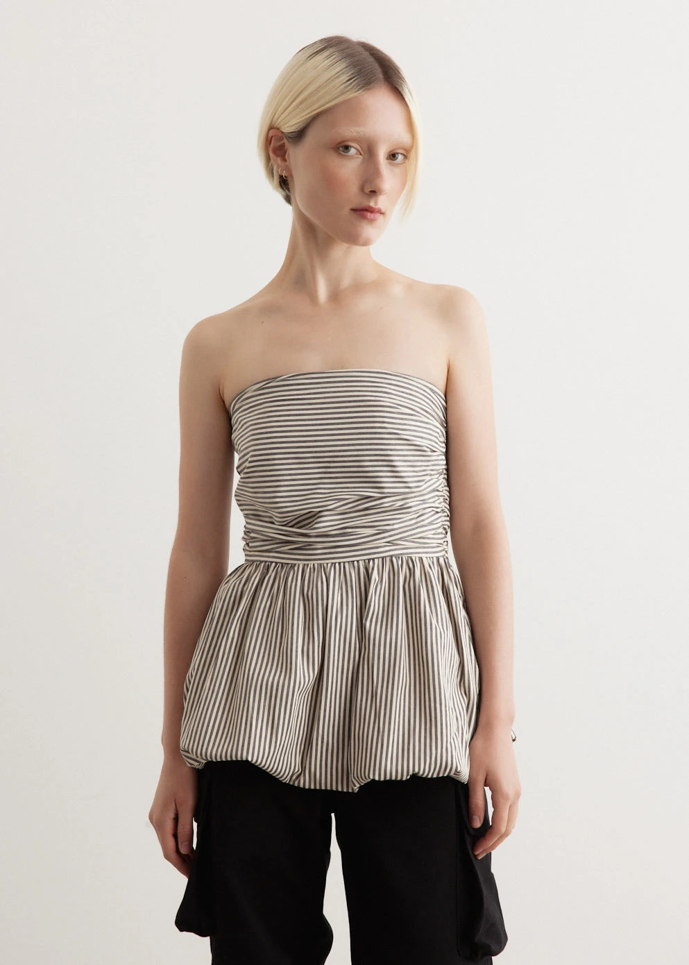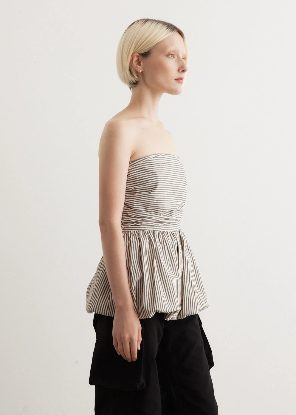 Blanca is the first ready-to-wear collection from Sydney-based brand Reliquia Collective. Known for their one-size-fits-most silhouettes and vintage-inspired aesthetic, the brand has become a local favourite. Made from a cotton-tencel blend, the Tiffany Top is a modern take on a bandeau style tube top with its distinct bubble hemline. A striped pattern adorns the fabric that adds contrast and complements the silhouette.