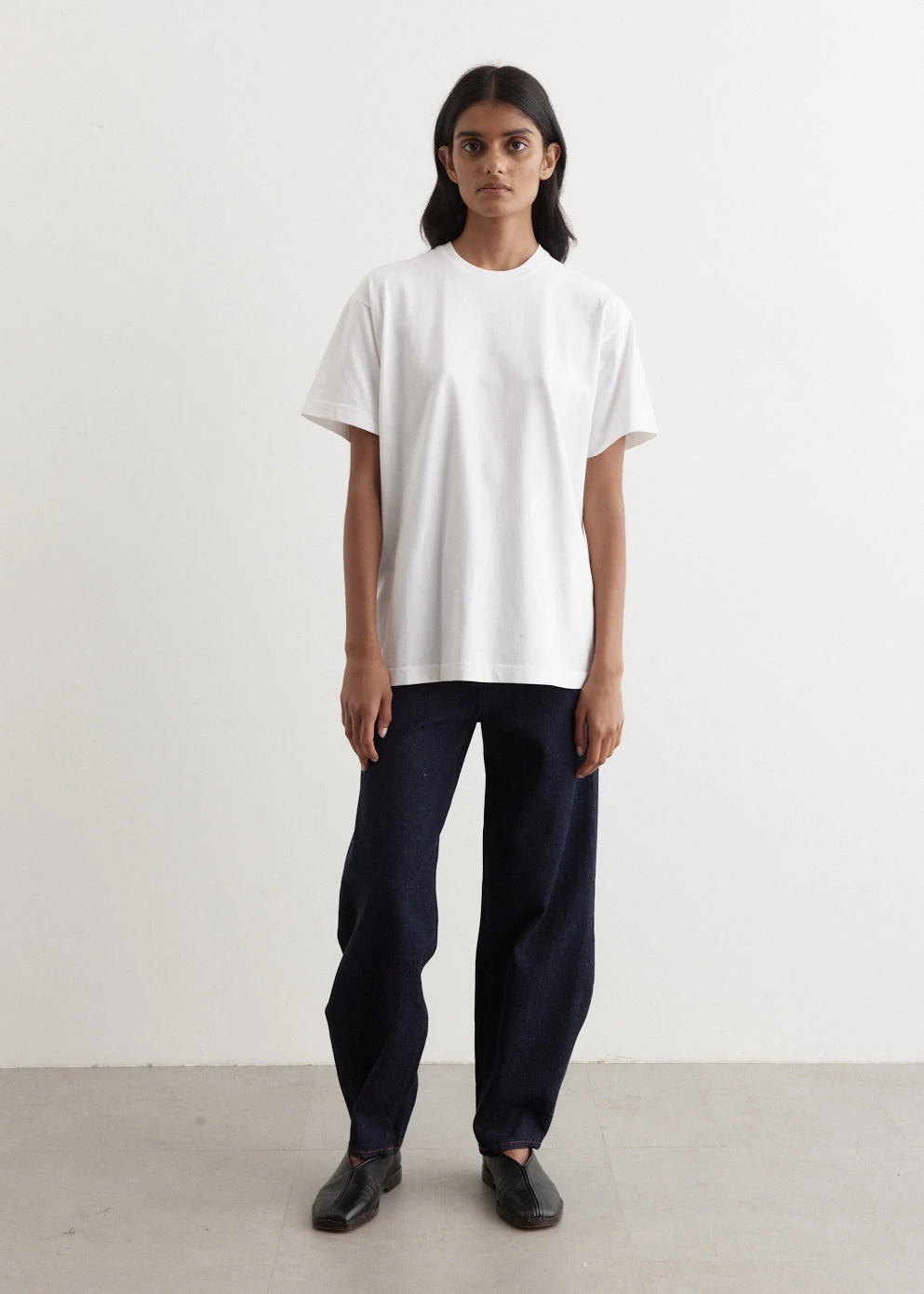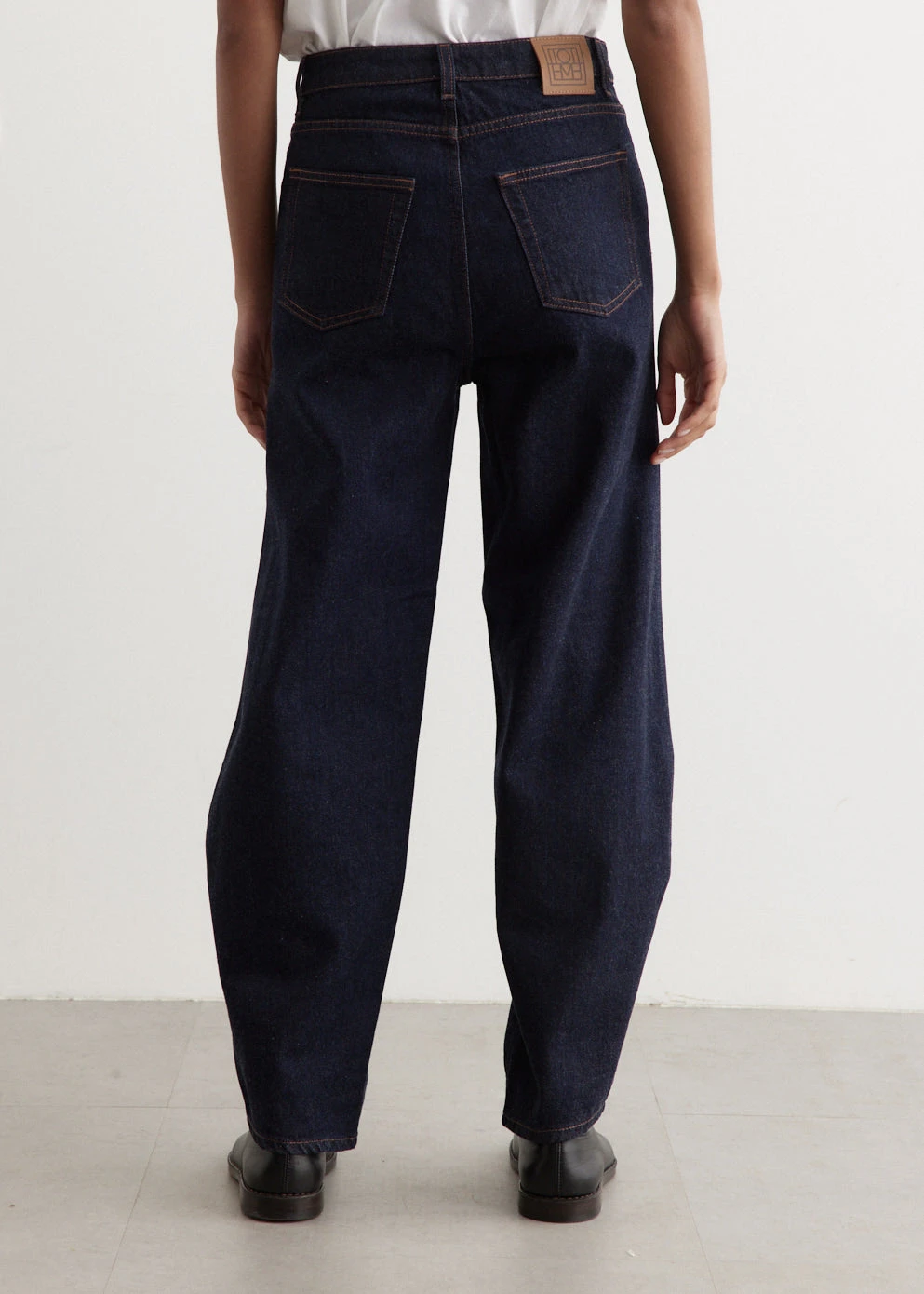 Founded in 2014 by Elin Kling and Karl Lindman, Toteme is a Stockholm-based brand renowned for crafting elevated essentials and timeless wardrobe foundations. Crafted from rigid organic cotton denim with a raw finish, the Barrel Leg Jeans are distinct with its structured barrel leg silhouette.Â
