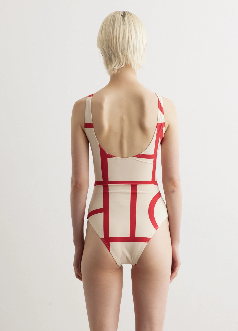 Founded in 2014 by Elin Kling and Karl Lindman, Toteme is a Stockholm-based brand renowned for crafting elevated essentials and timeless wardrobe foundations. Woven from a sun-protective jersey recycled polyamide-elastane blend, the Monogram Swimsuit is a one-piece style that’s adorned with an all-over monogram print.