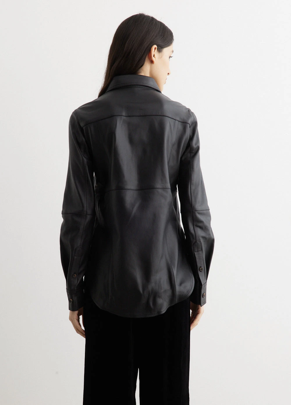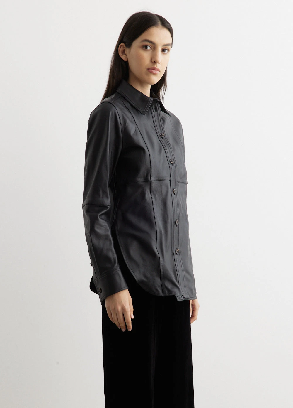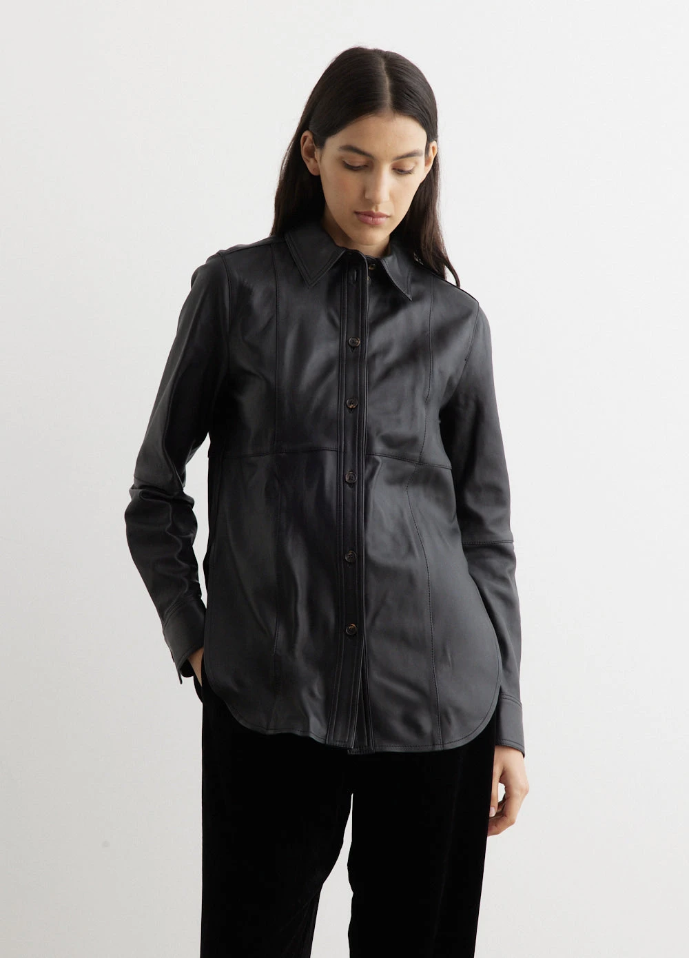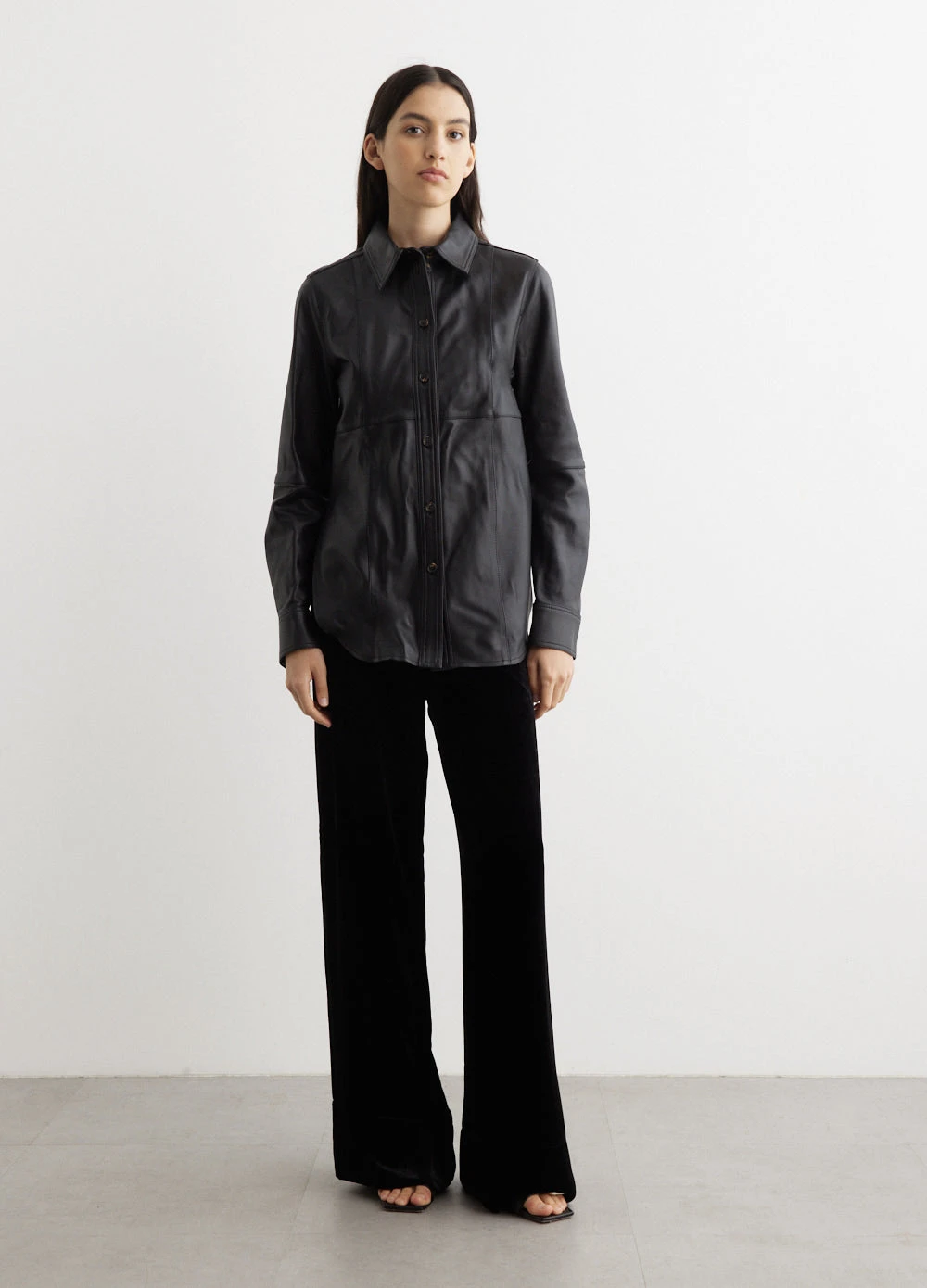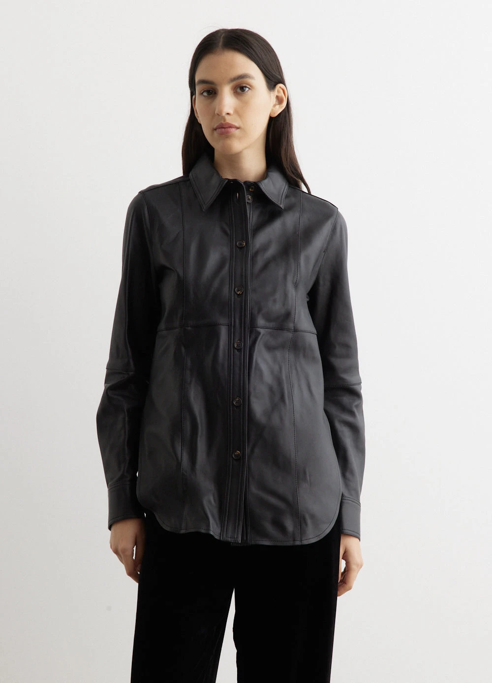Founded in 2014 by Elin Kling and Karl Lindman, Toteme is a Stockholm-based brand renowned for crafting elevated essentials and timeless wardrobe foundations. Made from lamb leather, the Slim Leather Shirt is cut to a regular fit and is detailed with stitching which emphasises the symmetrical panels.Â