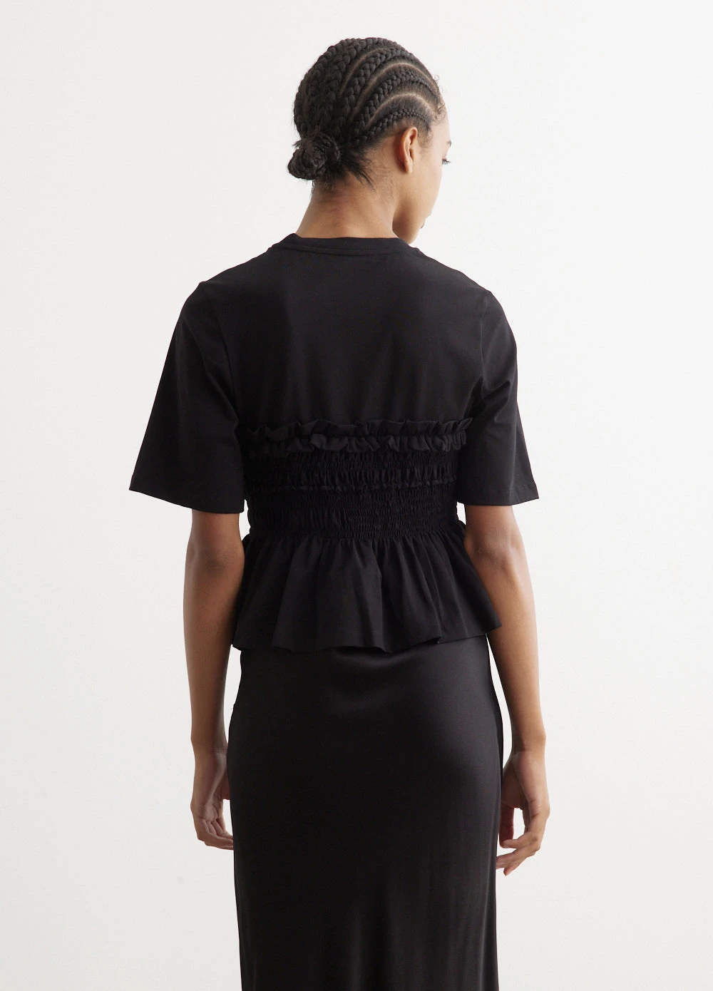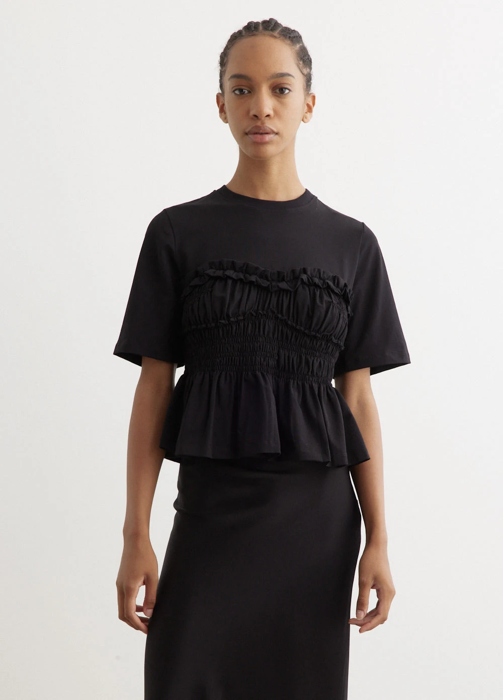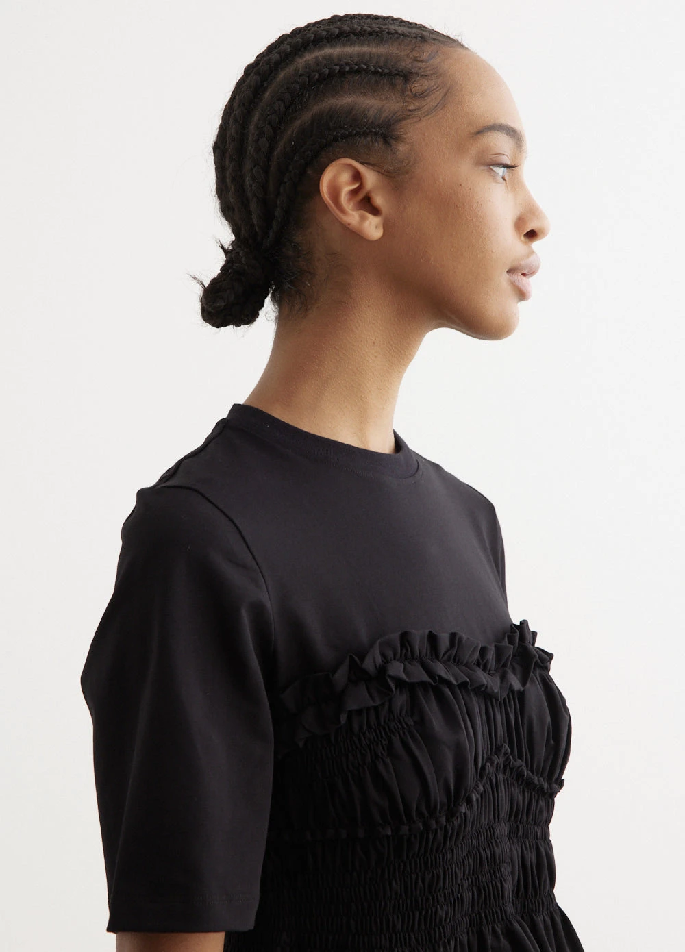 Cecilie Bahnsen, a Danish fashion designer, is renowned for her eponymous brand that  blends traditional craftsmanship with contemporary design. Her collections, known for voluminous silhouettes and intricate textures, have earned acclaim for a modern, avant-garde take on femininity. Cut from cotton jersey, the Vilde T-Shirt This t-shirt is designed with ruching to create a structured silhouette that offers a couture-like contrast to the relaxed aesthetic of the t-shirt.Â