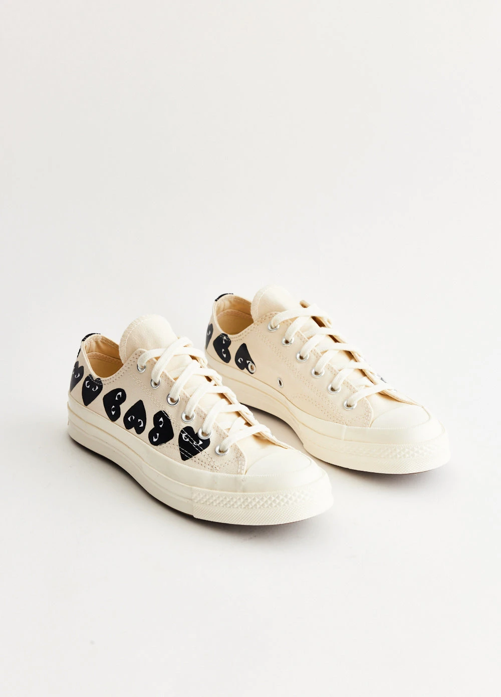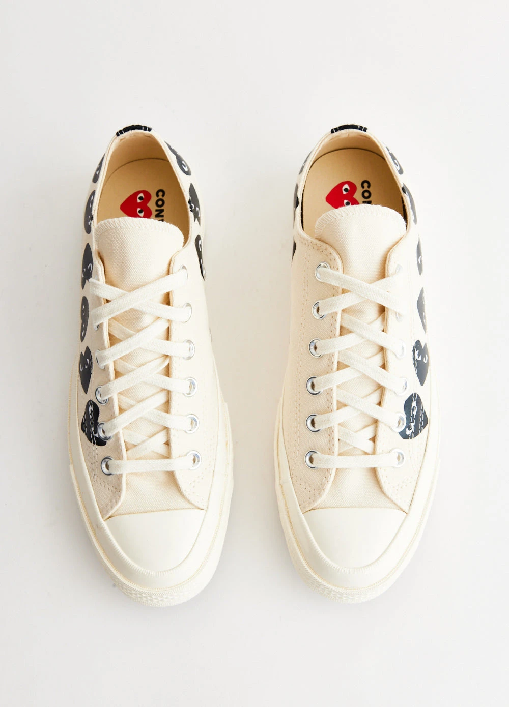 The long standing partnership between Comme des Garcons PLAY and Converse has been a cult classic since its inception in 2009. Upholding most of the iconic Chuck Taylor 70’s design elements, this iteration features a stripped back style with the addition of a signature PLAY logo on the sidewalls.