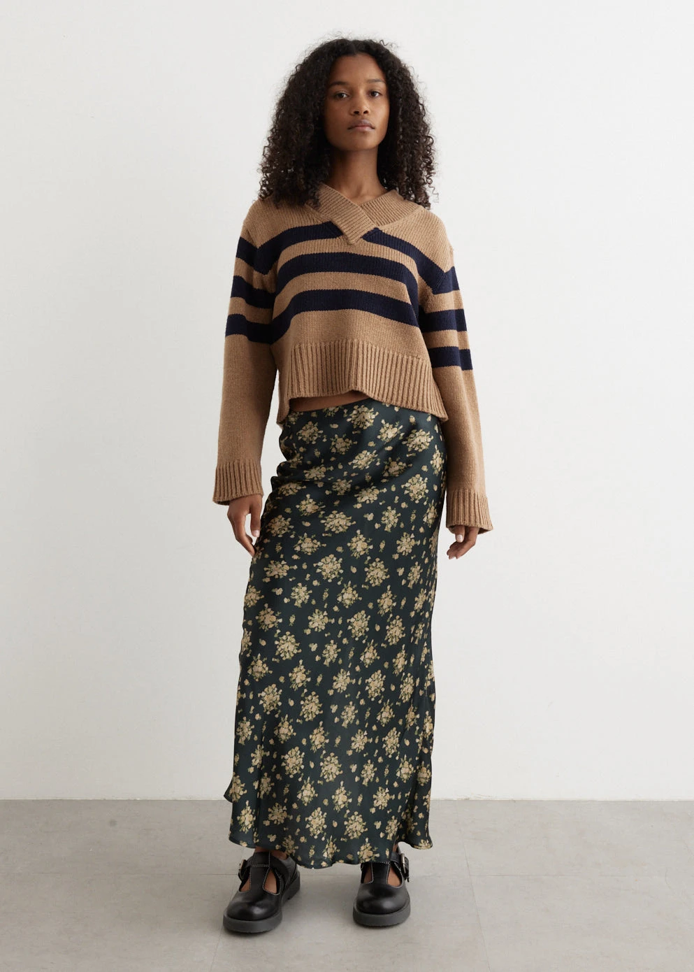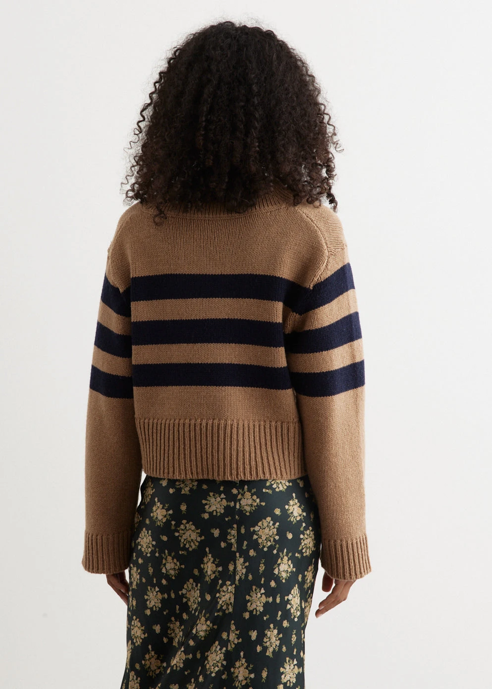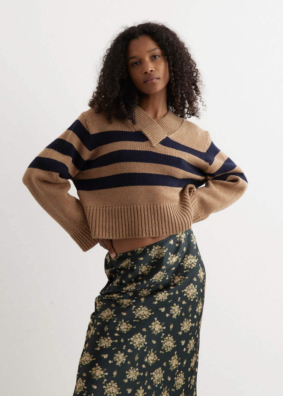 The California-based brand places vintage references at the heart of its design DNA, peppering its collection with ruched and ruffled details. The Zenato Pullover Sweater is a v-neck style cotton knit pullover. Featuring contrasting stripes, and ribbed trims.